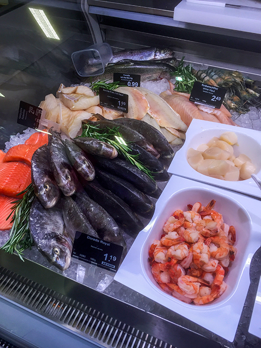 ちなみに同じスーパーの魚売り場です。売られているものはいつも変わります。デパートに行けば、ドイツの奥地としてはそれなりに充実していると感じられる魚売り場がありますが、いつも行く近所はこれだけしかありません。といっても全くないスーパーも多いので、あるだけでも良いのかもしれません。時々購入しています。