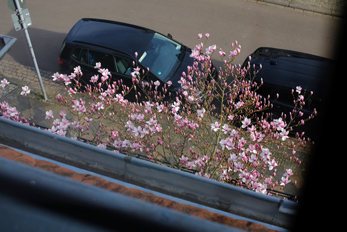 窓から下を見ると庭にあるモクレンの花が咲いているのが見えました。昨日までは咲いていなかったので、花が咲いているのを目にしたときに喜びがありました。全てが咲いているわけではないですが、しばらく花の色が楽しめそうです。