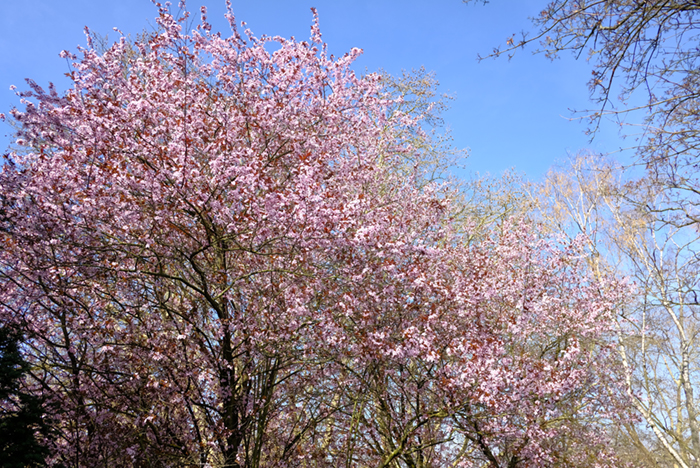 午前中に撮影しました。散歩をする人、ジョギングする人たちがいるだけで、人はあまりいません。しかし午後6時ごろ、同じ場所を通ると、気温が19度と暖かいこともあってか、多くの人がこれらの木の周りにいました。そして写真を撮っている人も多くいました。ドレスを着て撮っている人、犬を抱いて撮っている人、年配の方々、家族など、様々な人が撮っていましたが、殺伐とした雰囲気はなく、平和的に撮っているという印象です。どこか気持ちが温かくなるような、ほのぼのした風景が見られました。