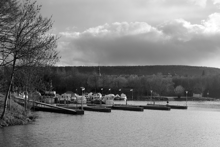 ザールブリュッケンの街角 荒れた天候 by ey 2019年3月13日 日中は風が強く、晴れたり雨が降ったりの天候でしたが、夜には突然の土砂降りになり雷が響き始めました。雹が降っています。写真は風があるザール川の停泊所です。