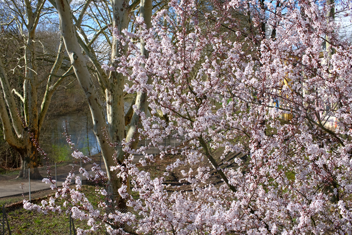 ザールブリュッケンの街角 春の兆し by ey 2019年3月18日 植物の名前は全く分かりませんが、桜でしょうか。近所のザール川沿いを歩いているときに見かけましたが、白、ピンク色だと目立っています。風があって空気はまだまだ冷たいですが、春らしさが感じられます。