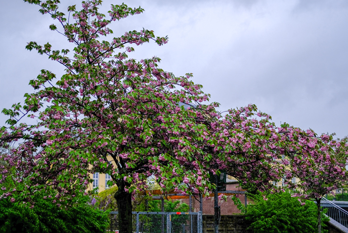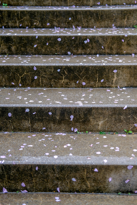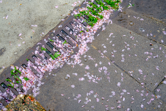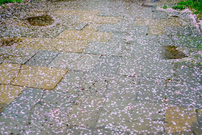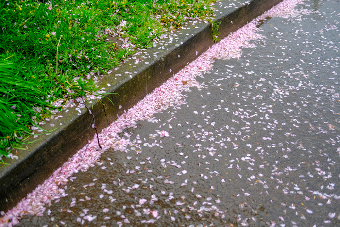雨と風で落ちた桜の花が地面をピンク色に染めています。