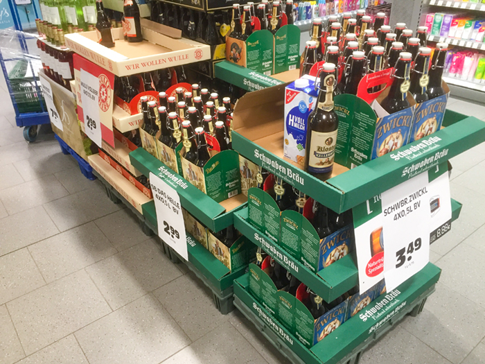 ドイツでは水よりビールの方が安いとよく言われています。実際はレストランなどでは、全てが安いというより、安いものもあるといった状況です。しかしスーパーで見ると、ビールの方が安いのが実感されます。近所のスーパーですが、4本で2.99ユーロ、4本で3.49ユーロとなっています。感覚的にはそれぞれ4本で300円、350円といった感じです。改めてビールが身近にあるのが感じられました。