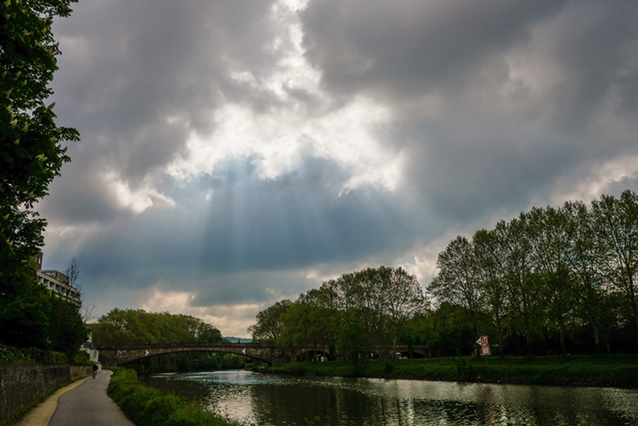 午前中、外出先からの帰りに撮影。曇り空の間から綺麗な光が伸びています。身の回りには美しい世界が溢れている気がします。