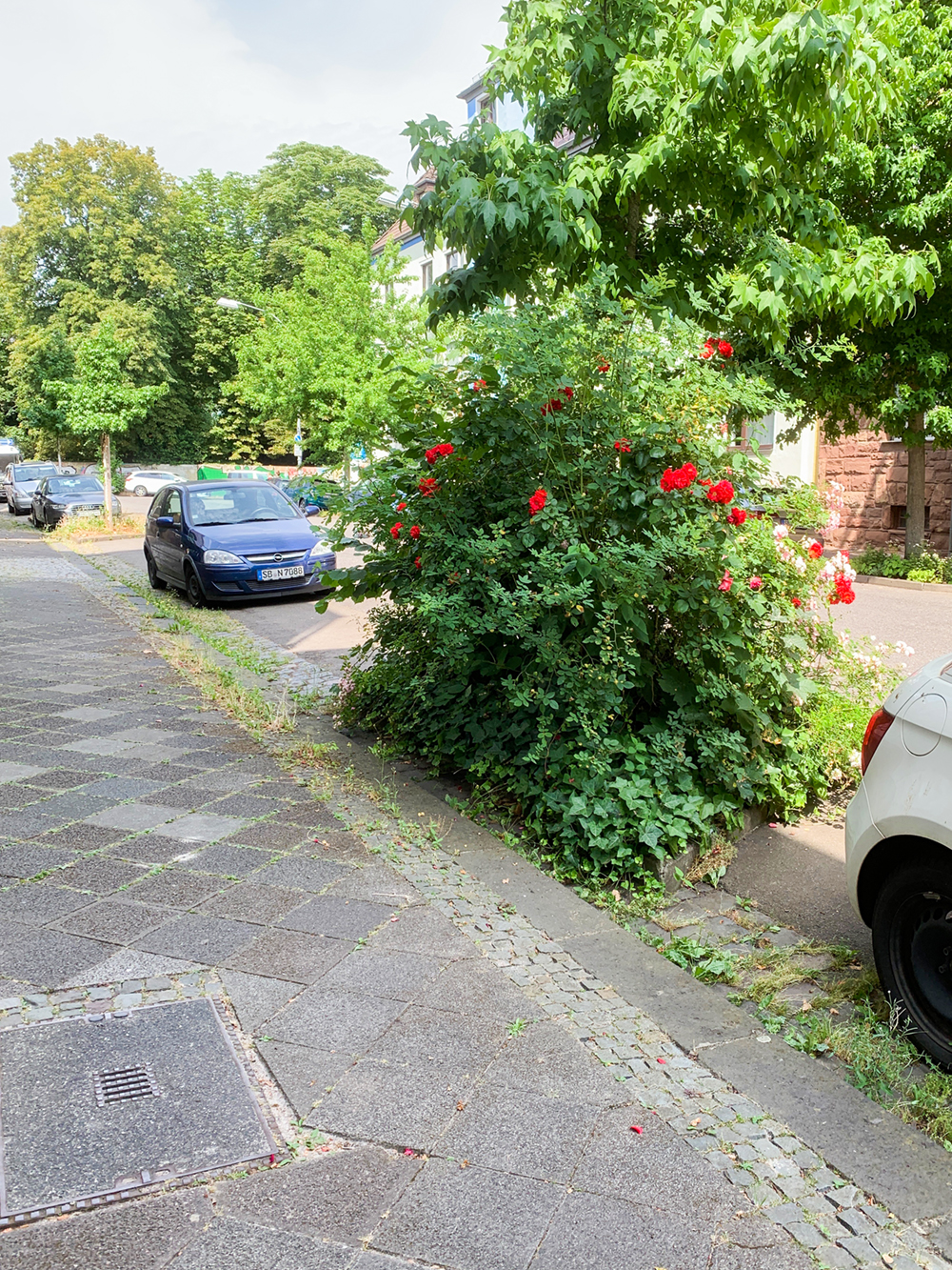 ザールブリュッケンの街角 街路樹 by ey 2019年7月8日 近所の街路樹です。大小様々な木だけでなく、花も植えられています。ここは道路と駐車スペースとを分けるために植えられていますが、景観向上にも役立っています。また歩道に植えられているのではなく、路上側に植えられているのも人に優しい気がします。