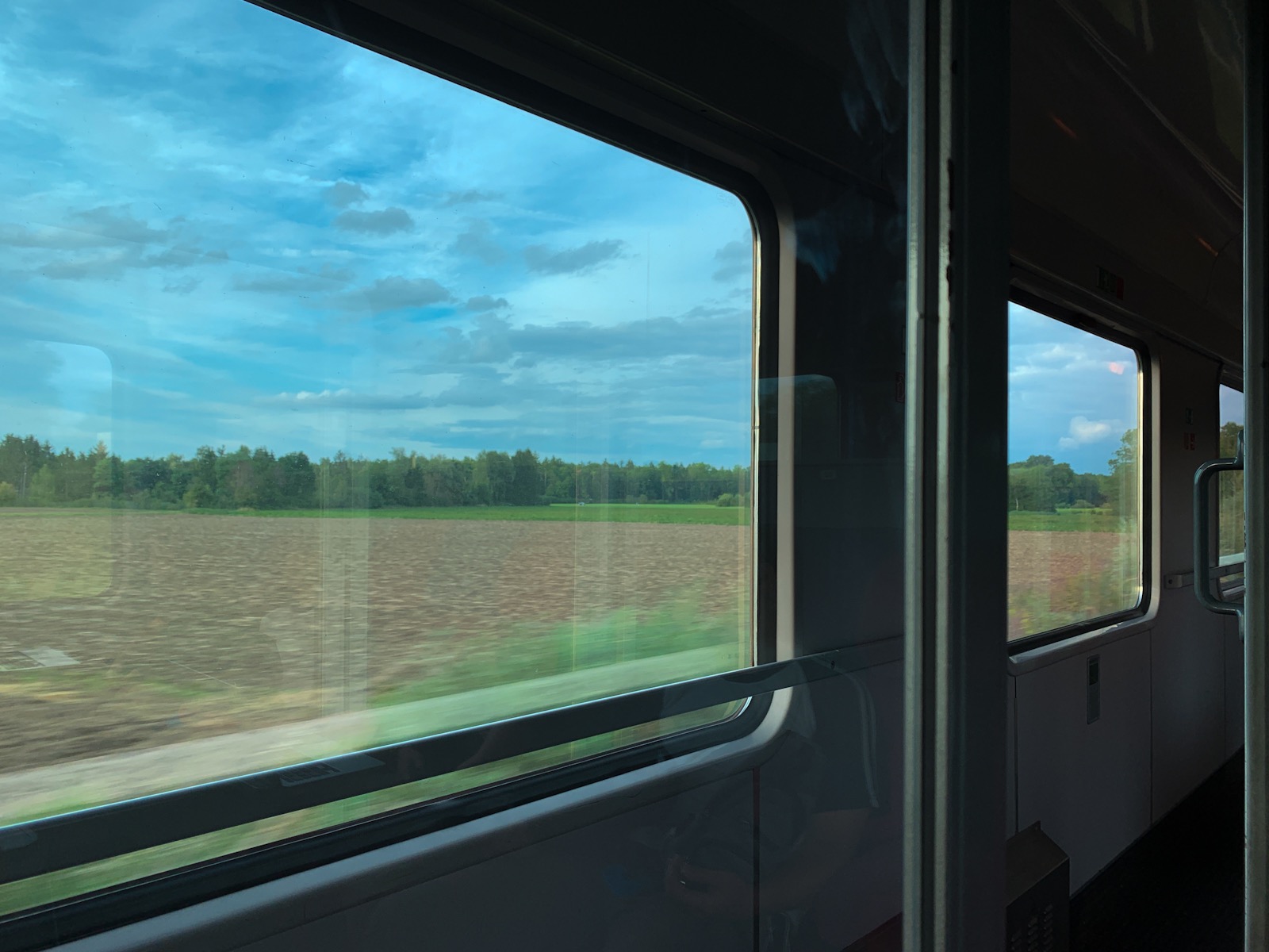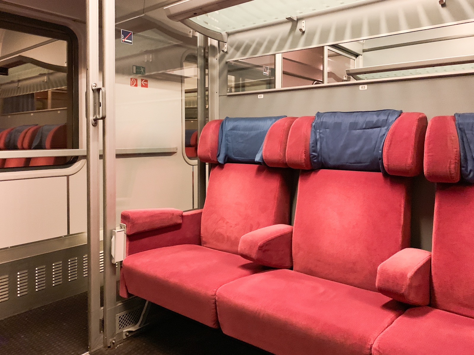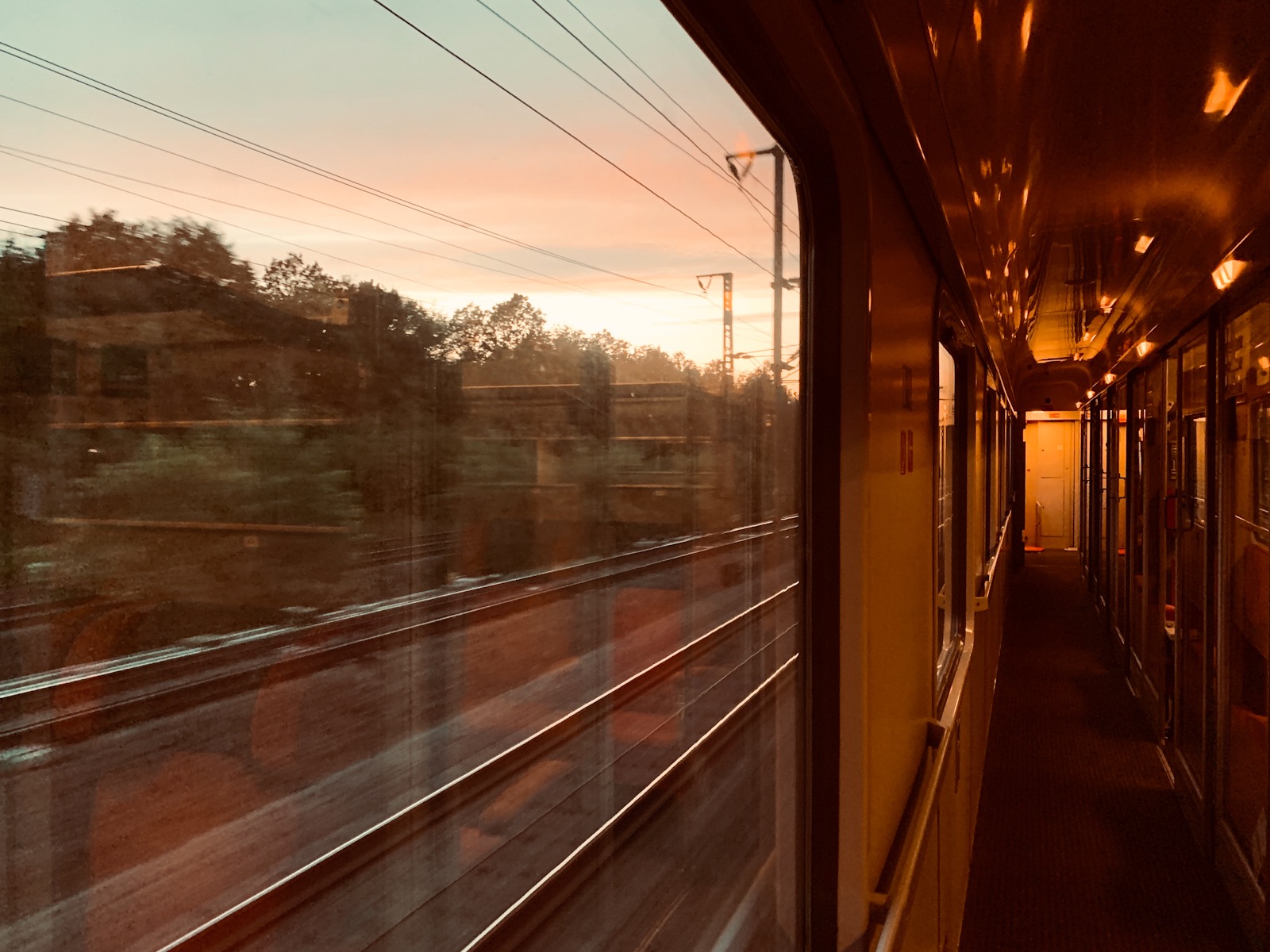 照明と夕焼けで綺麗です。ヨーロッパの電車の旅といった雰囲気があります。