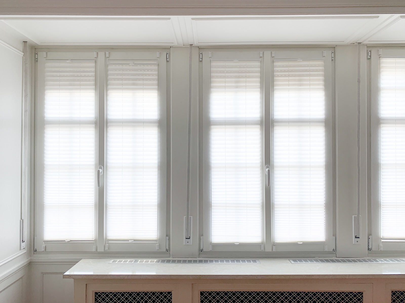 写真は夕方ですが、朝はまるで後ろにバックライトがあるかのような明るさになります。見た目もスッキリとしていて良いかもしれません。左2枚の窓はシャッターが少しだけ下ろしてあります。