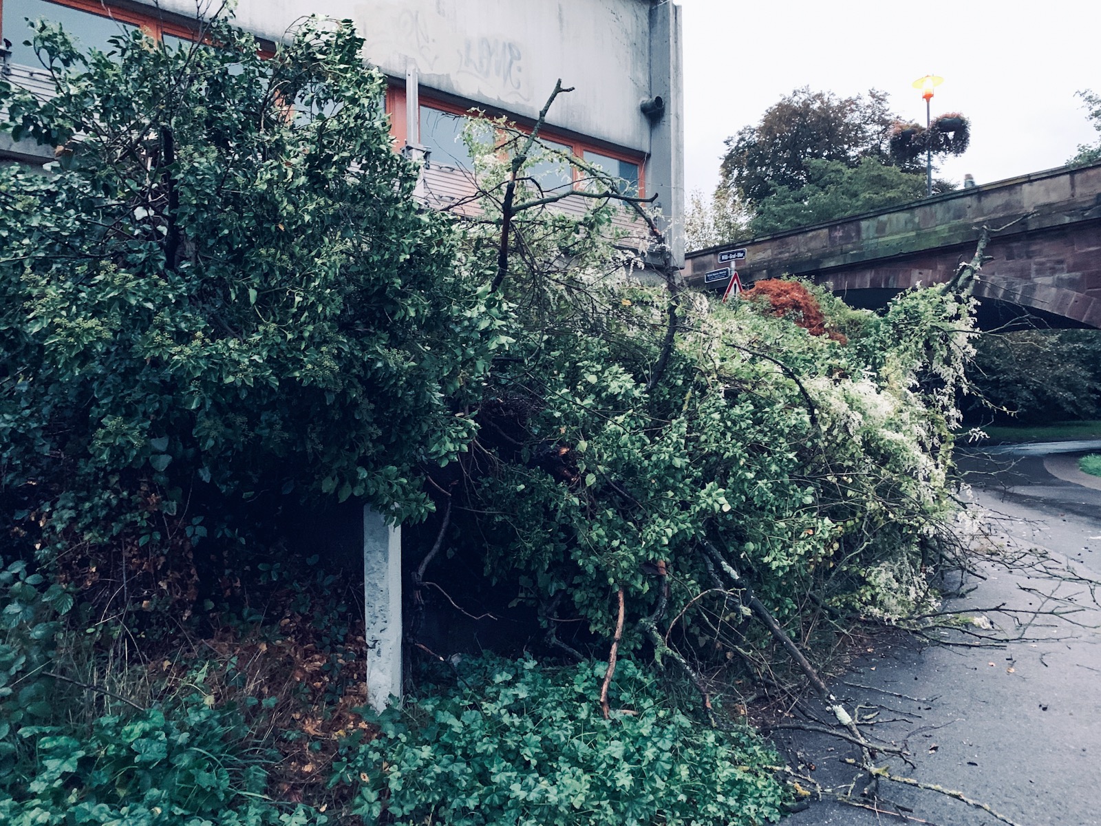 その後、外出時に目にした光景ですが、これが今日の雷雨のせいなのかは分かりません。しかし風の強さが感じられます。