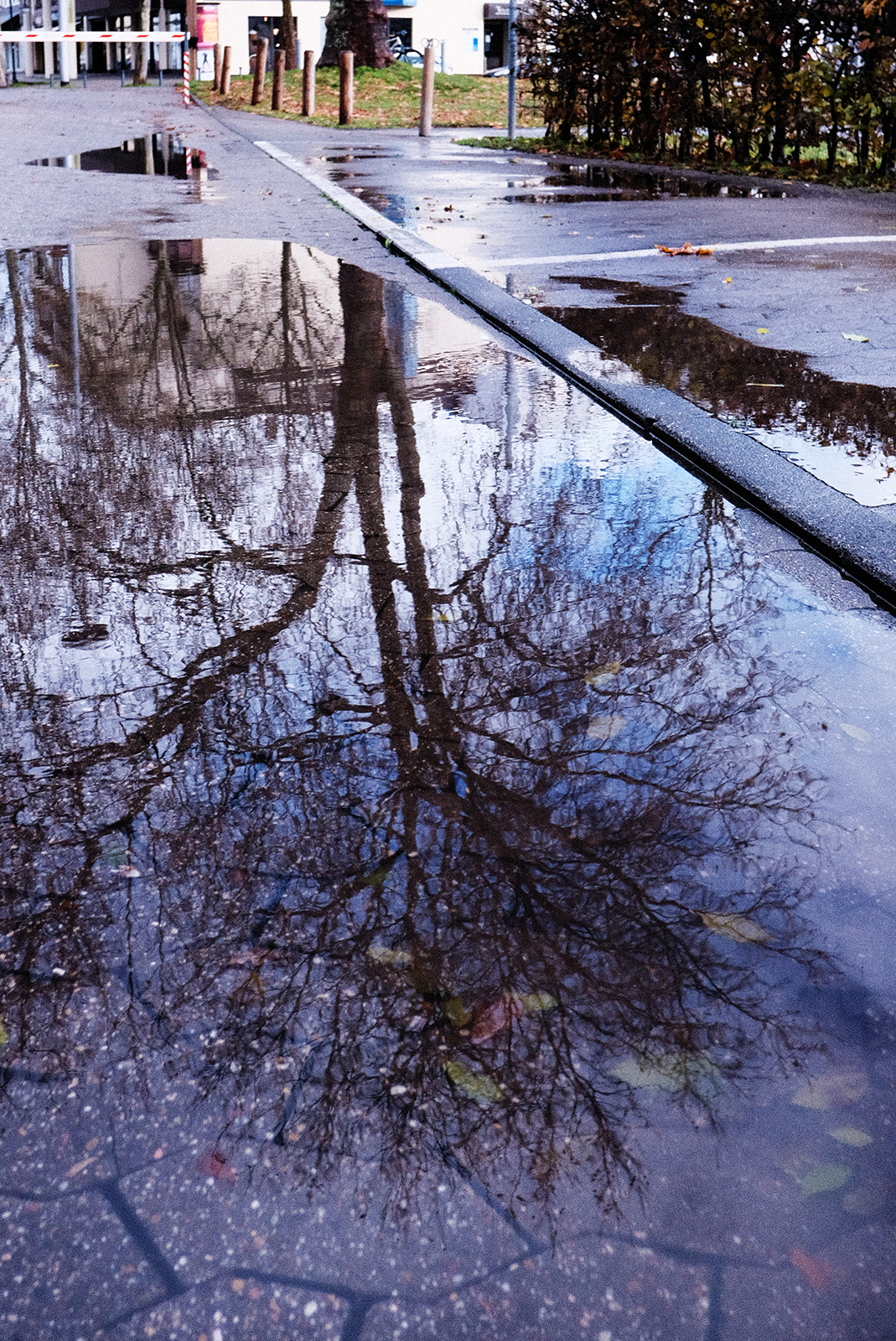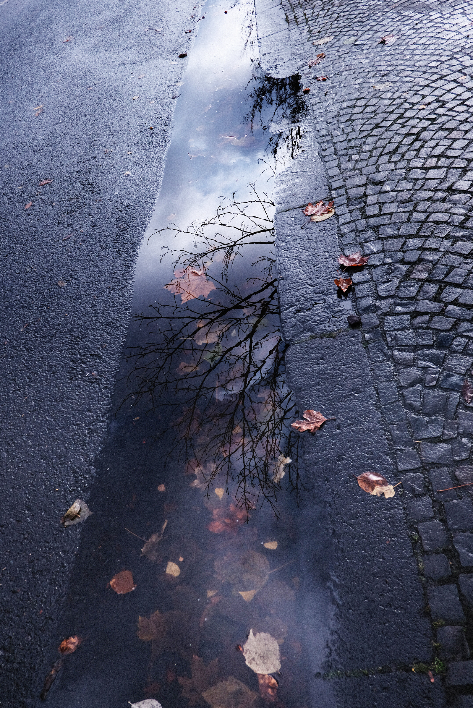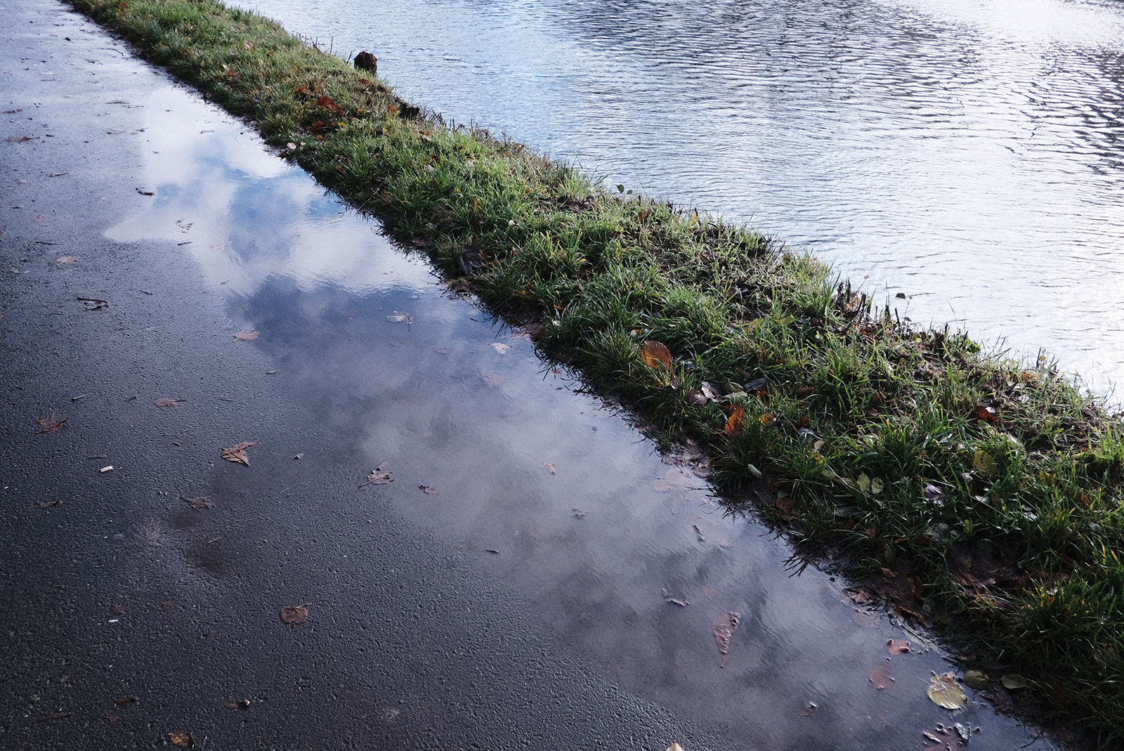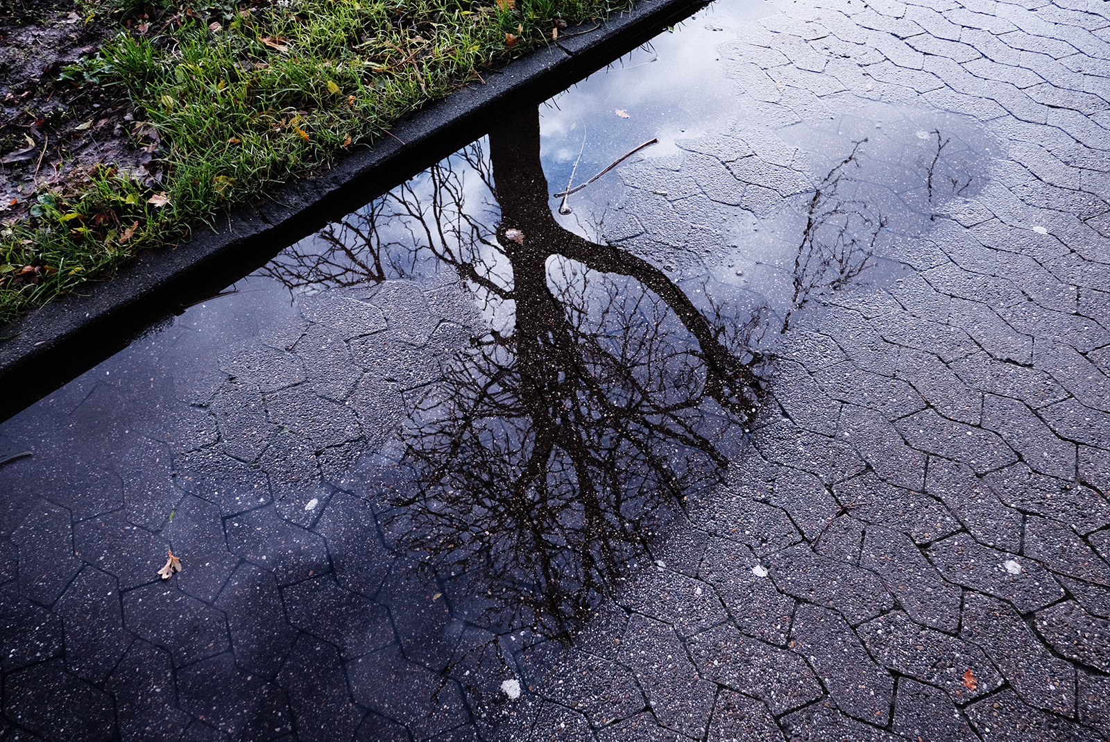 今朝は強い雨音で目が覚めました。窓の外のシャッターをたたくような音です。朝にはその雨も止みましたが、午前中、外に出た時に見ると水たまりが幾つもできていました。いつもより大きく深いです。しかし水に映る世界は別世界のようにも見え、こちらの世界とは違う奥行きが感じられます。