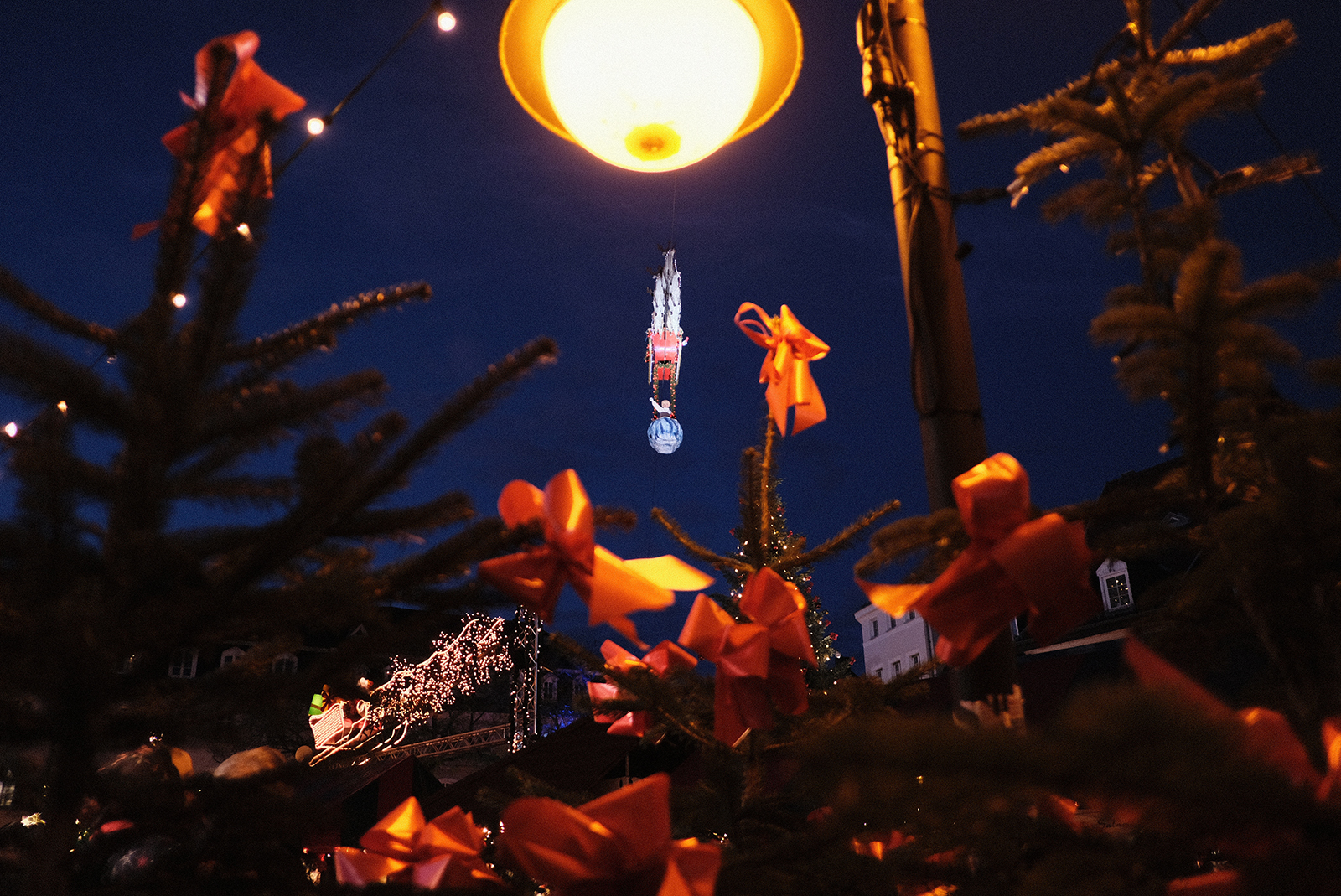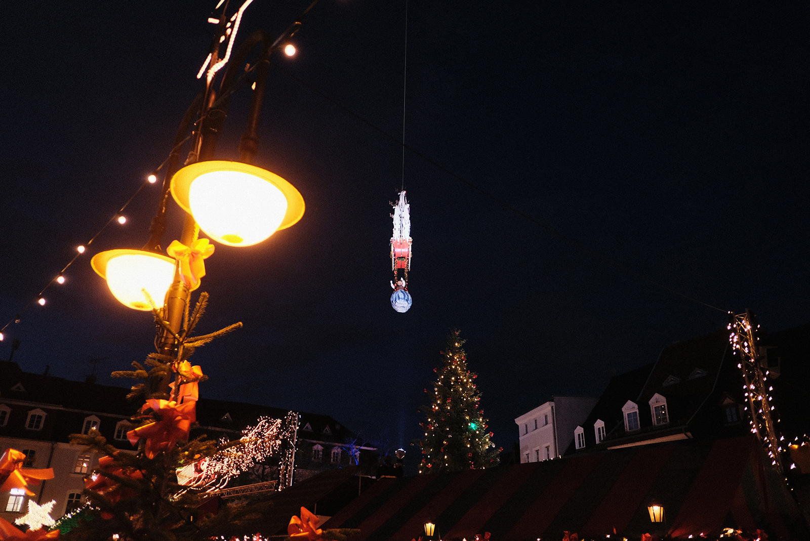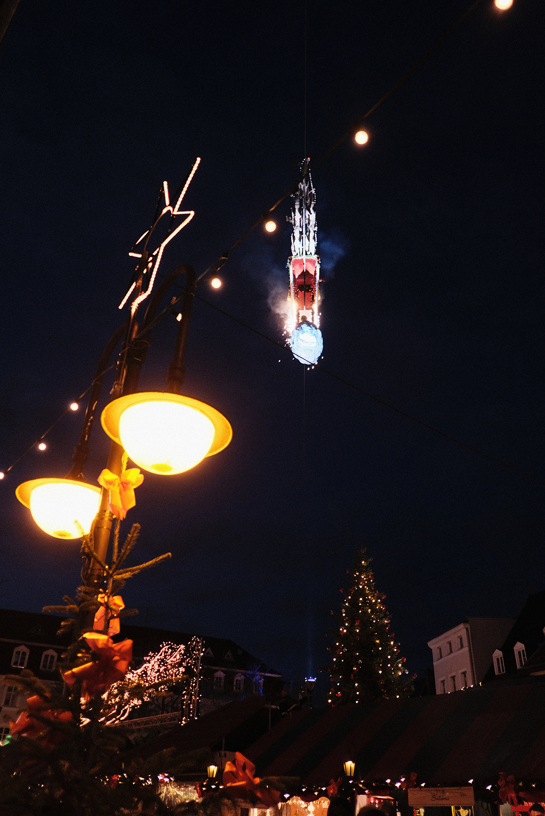 クリスマスマルクトの「空飛ぶサンタクロース」を見ました。今年に見るのは今日が初めてです。毎日2度、日によっては3度飛ぶこともありますが、10年以上飛んでいるにもかかわらず、見る人が多いです。小さな子供に見せたいという人もいれば、大人も楽しんでいるといった印象です。今年は少し違う場所から撮りました。写真左下のサンタクロースのイルミネーションとの共演です。