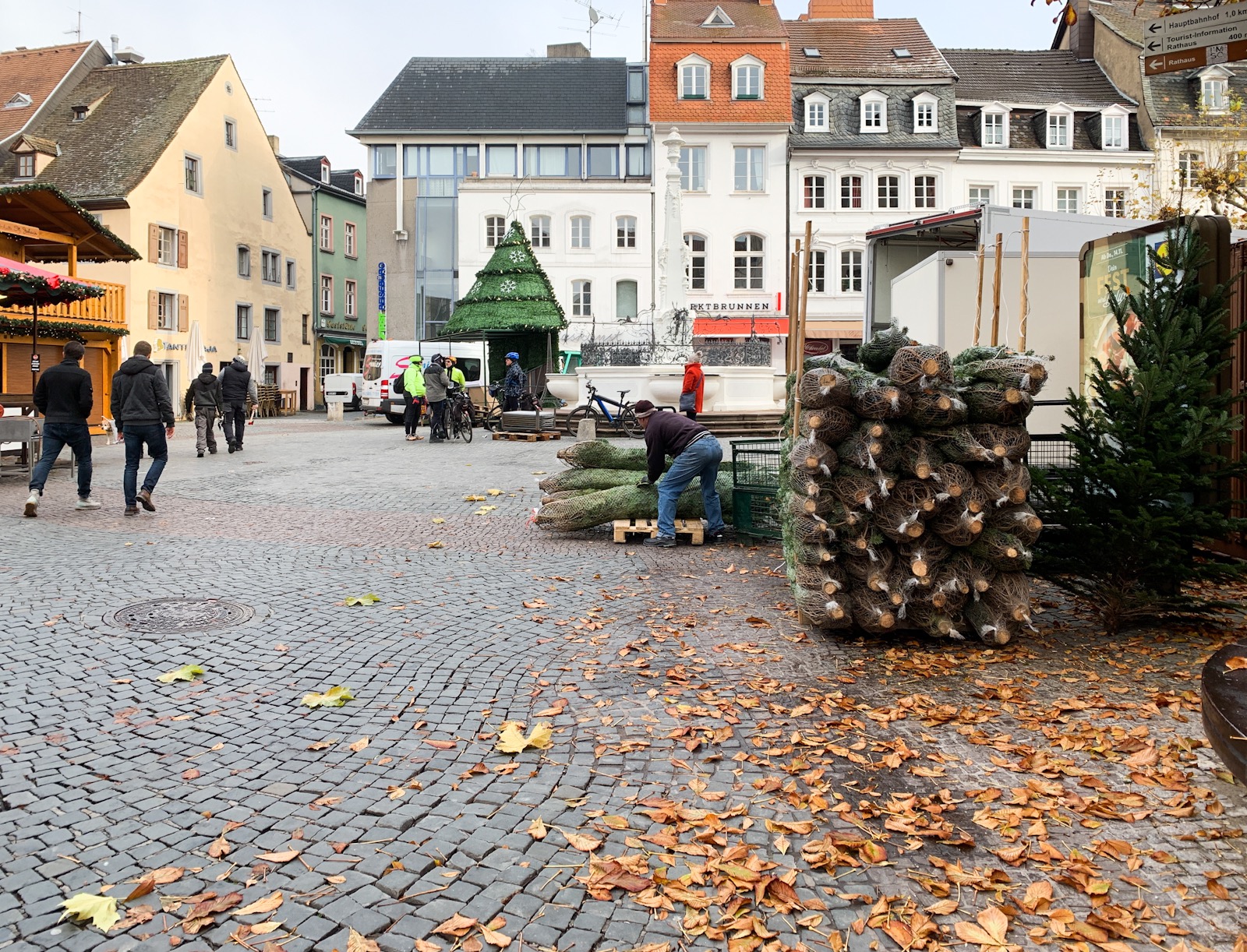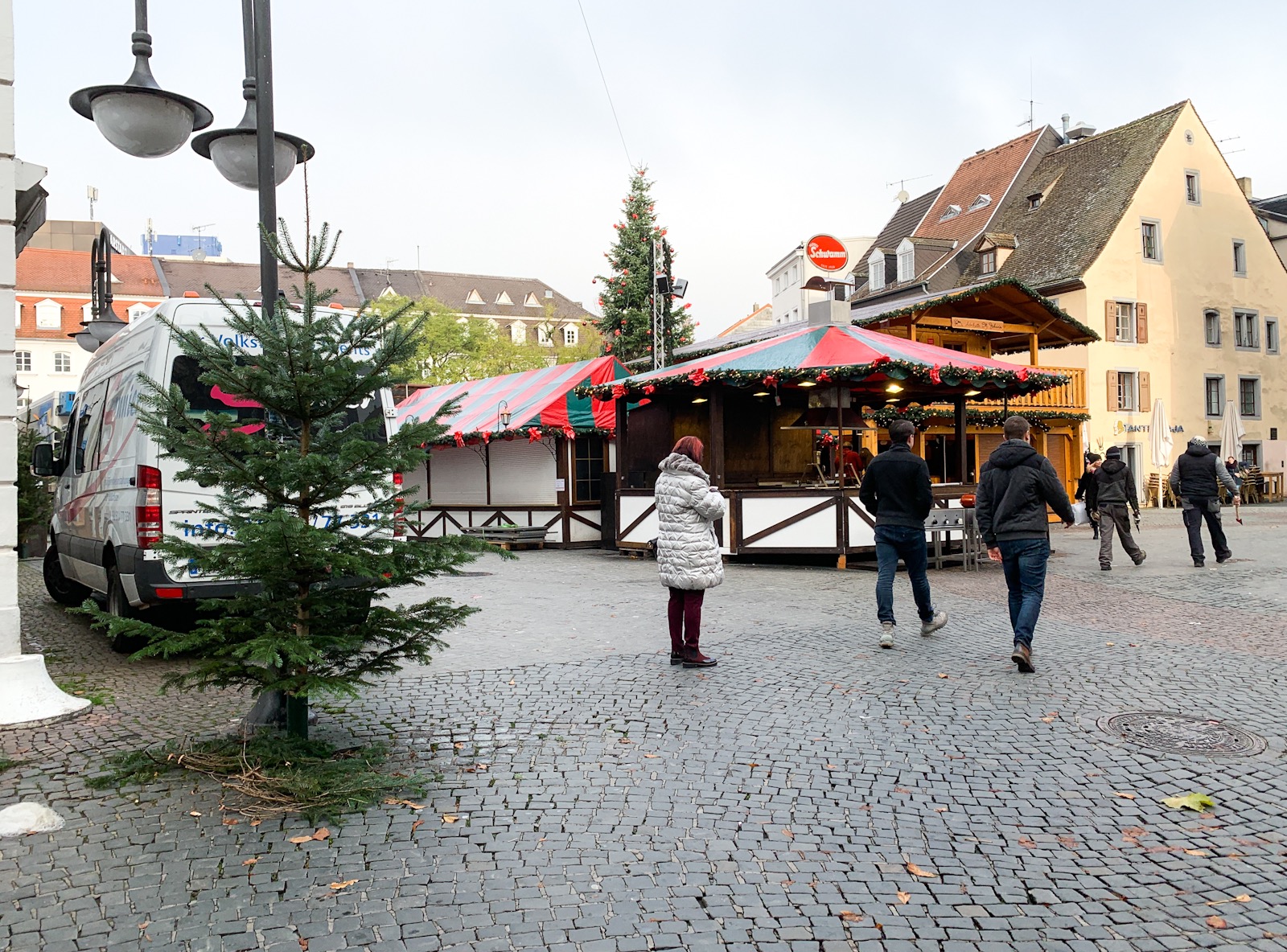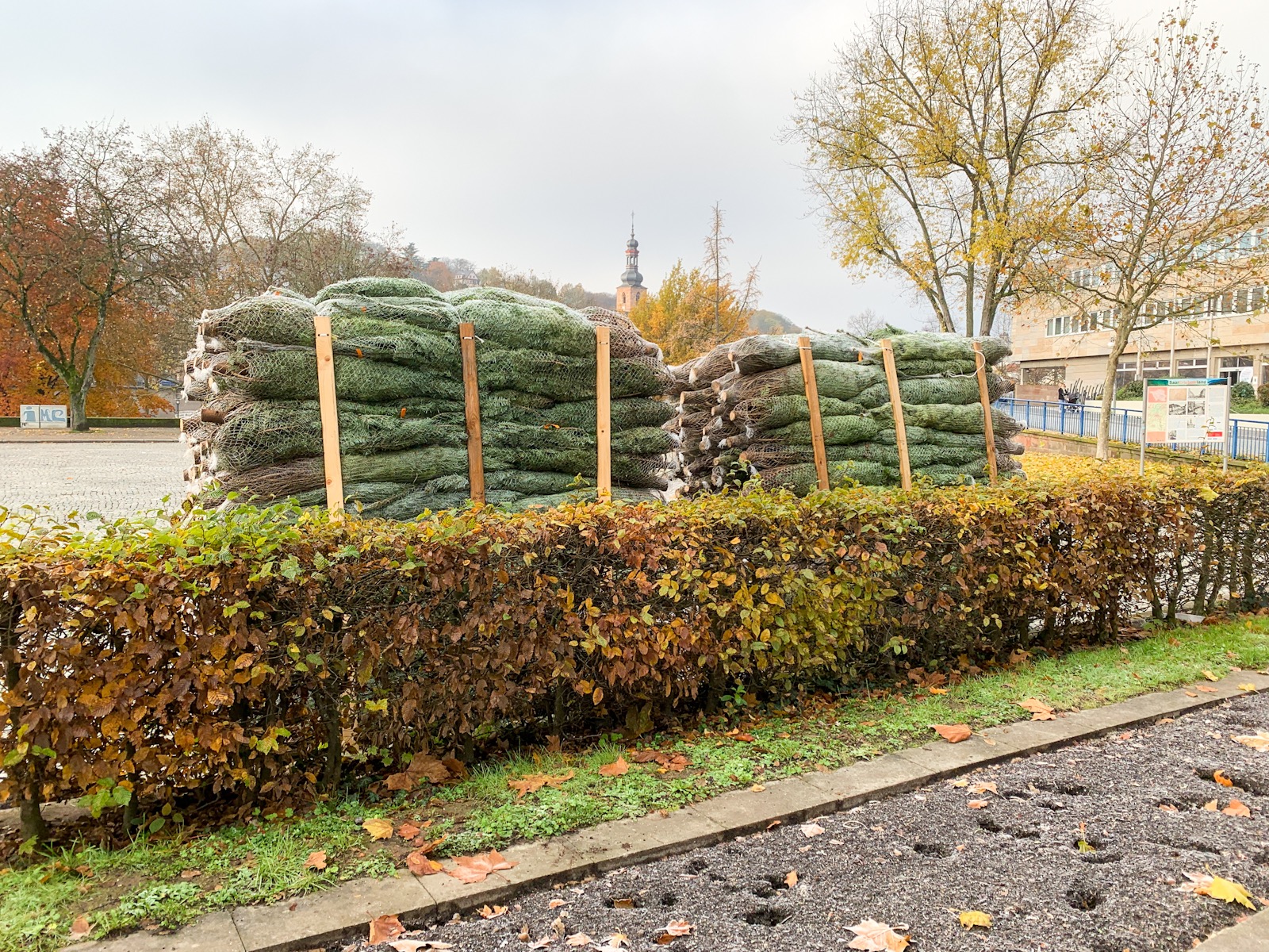 クリスマスマルクトの準備が進められているのが分かります。近くにはネットに包まれたツリーが、まとめて置かれていますが、これがいつも粽(ちまき)のように見えます。屋台の店頭などに飾られるツリーです。