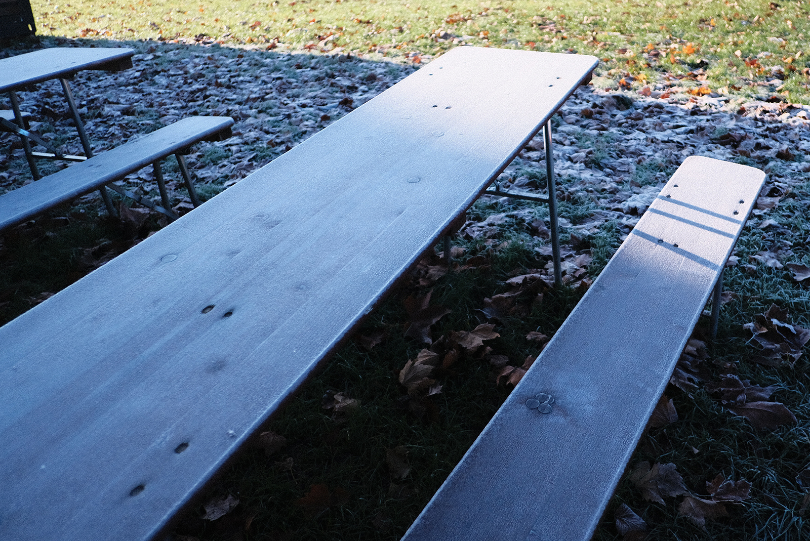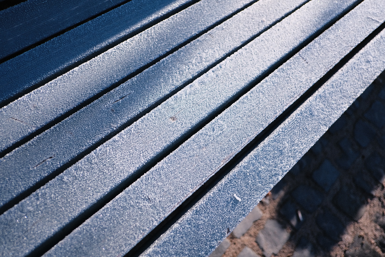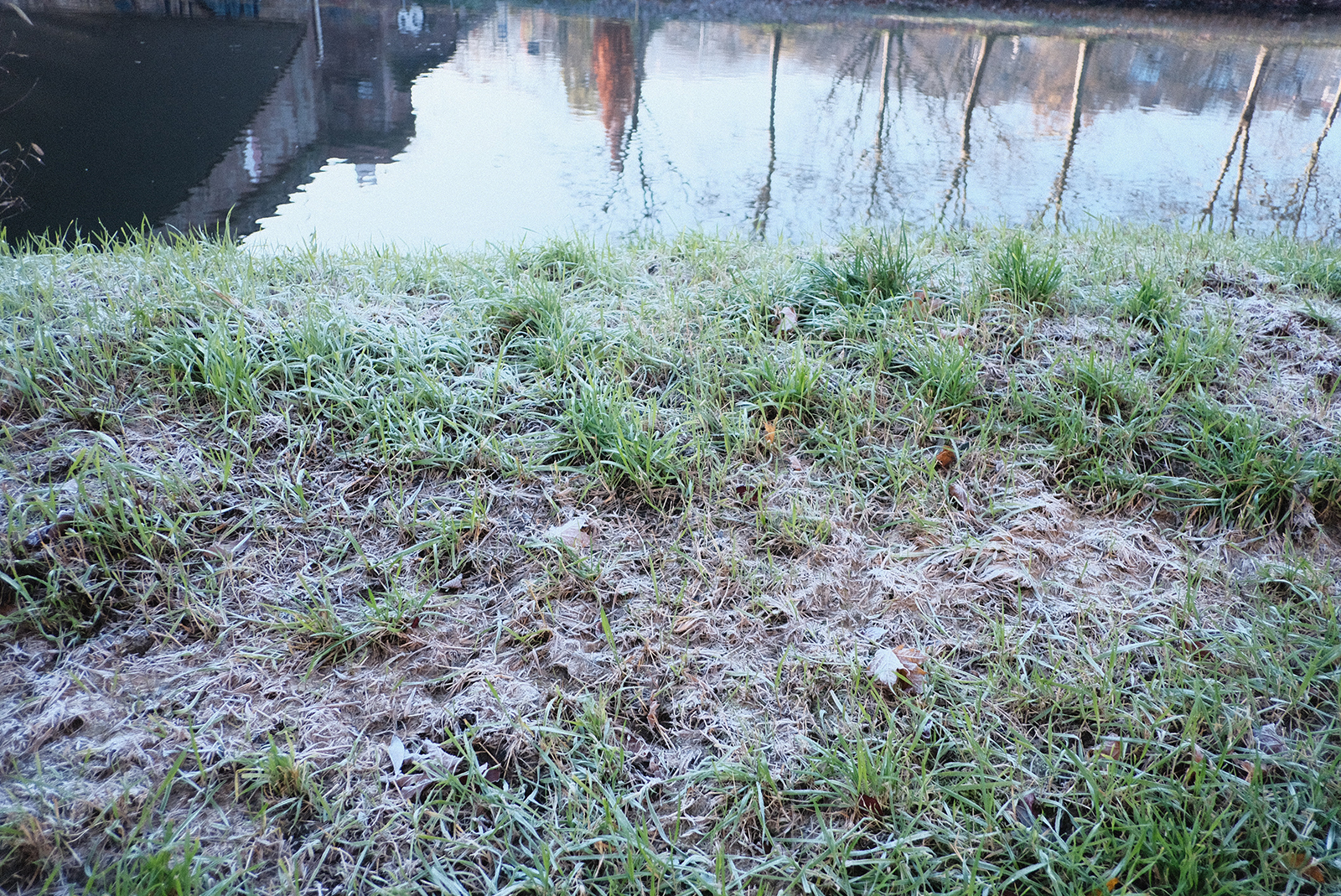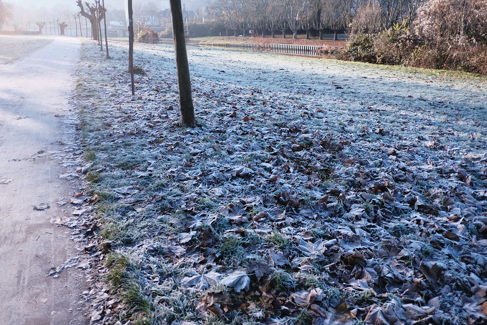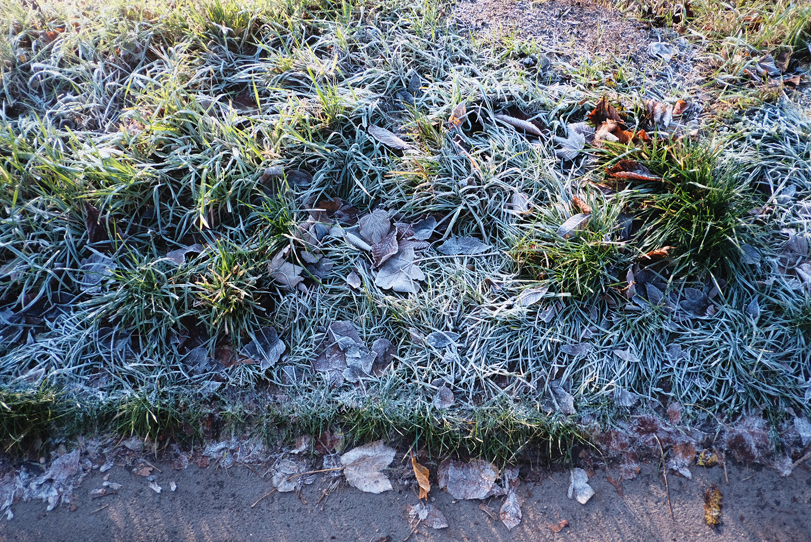 朝の気温は1度、体感温度は-3度となっていました。しかし外でもそこまでの寒さは感じられません。ただ外では霜が降りているので、その数字通り、冷えていたのかもしれません。光を受けて光る霜や真っ白になった場所、その中で作業する人、画になる朝の光景です。