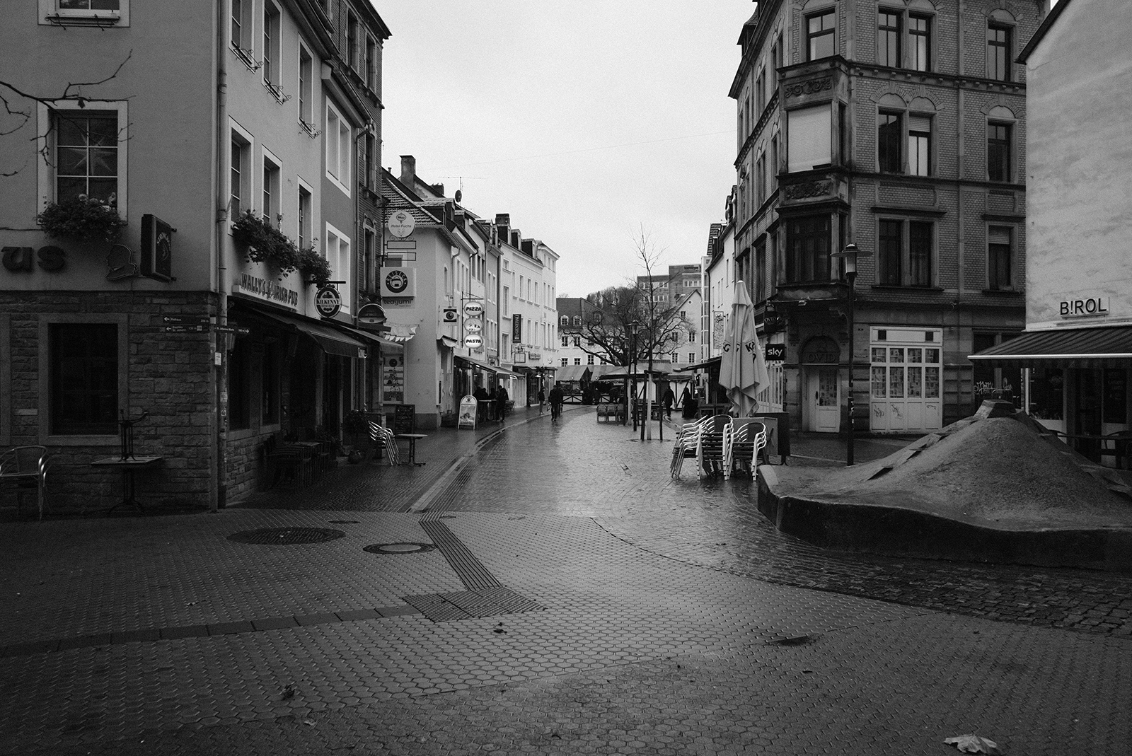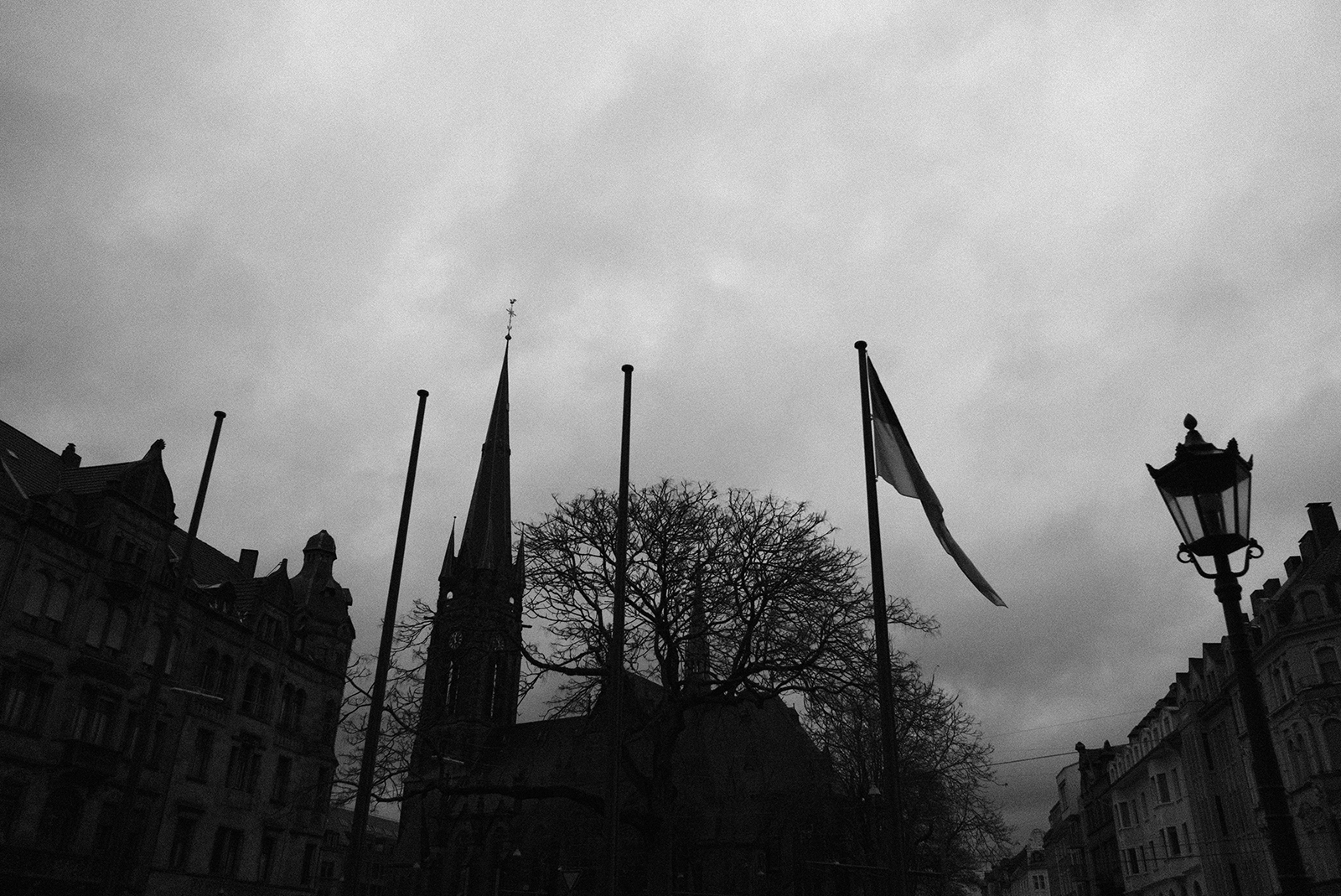 ザールブリュッケンの街角 モノクロ by ey 2019年12月13日 雨上がりの曇り空はモノクロが似合います。 街の中心近く、お昼ごろですが、ひっそり感があります。 肉眼ではあまり感じられない雲の表情、写真では分かります。