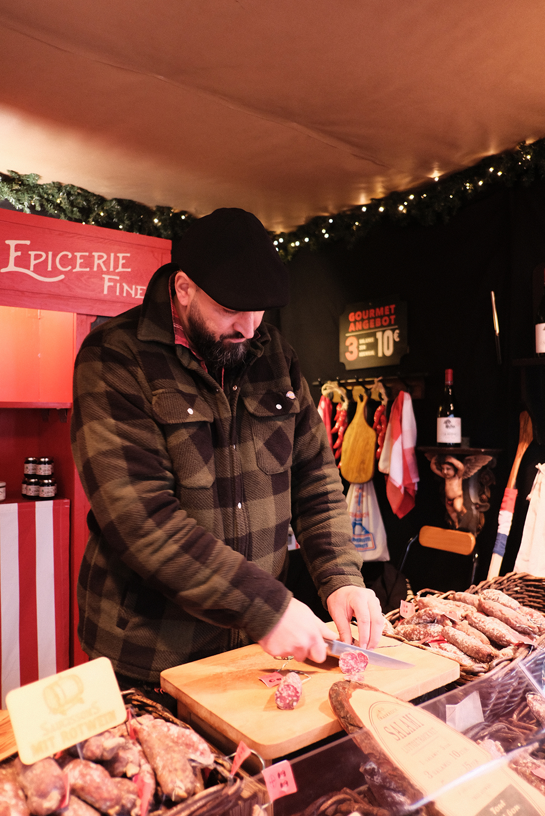 幾つかフランスのサラミの屋台がありますが、このお店のものが一番口に合うので、毎年ここで購入しています。8種類のサラミがありますが、最終日に残っていたのは2種類のみ。その場で試食できます。
