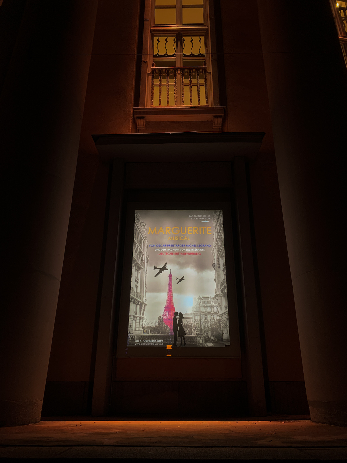 ザールラント州立劇場に行きました。ミシェル・ルグラン作曲「Marguerite」で、ドイツ初演です。劇場にあるポスター。第二次世界大戦のドイツ占領下のフランスの話です。