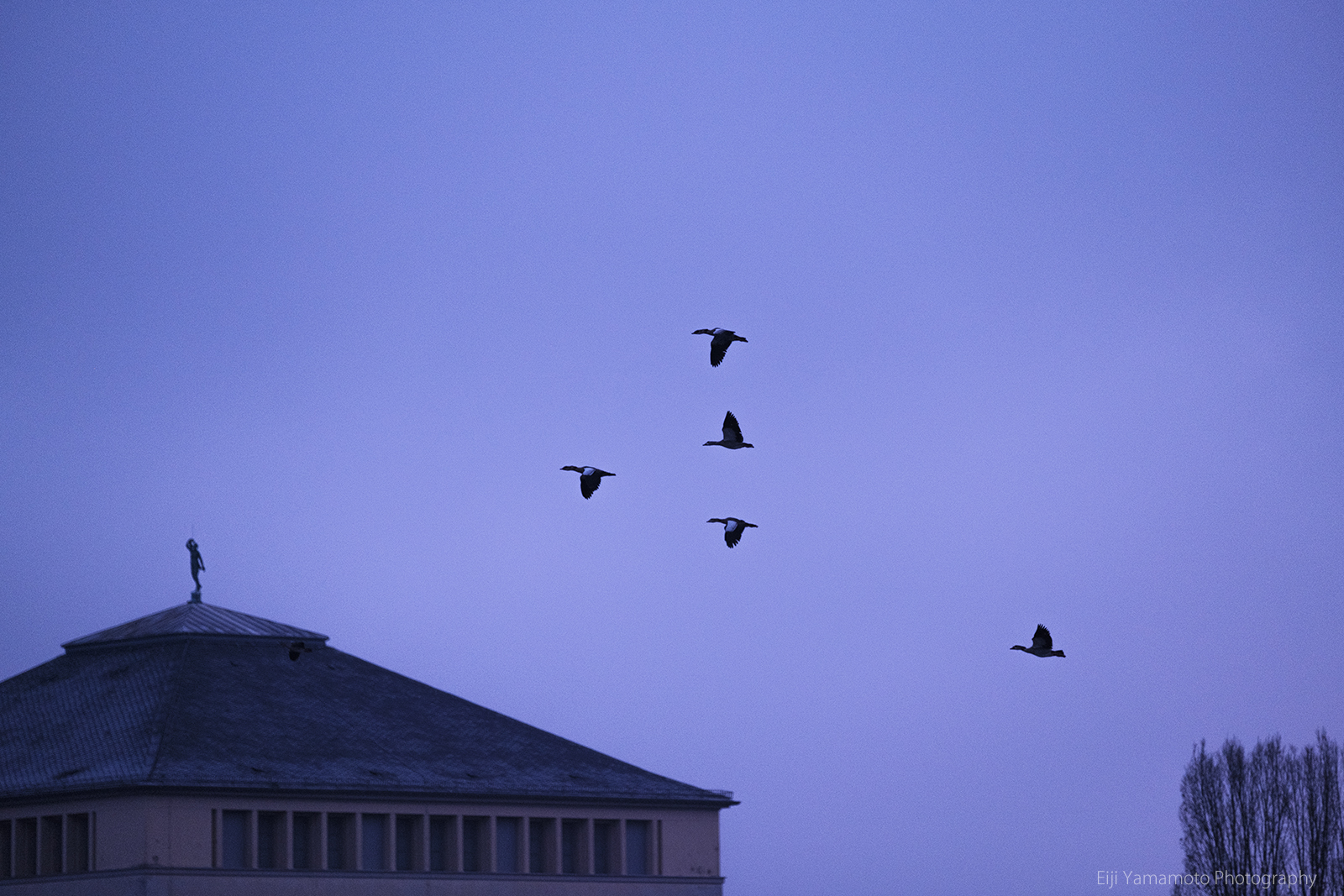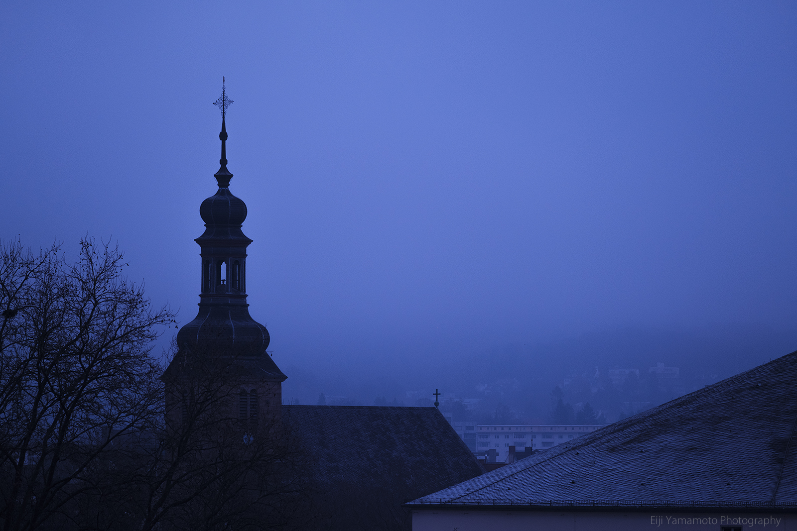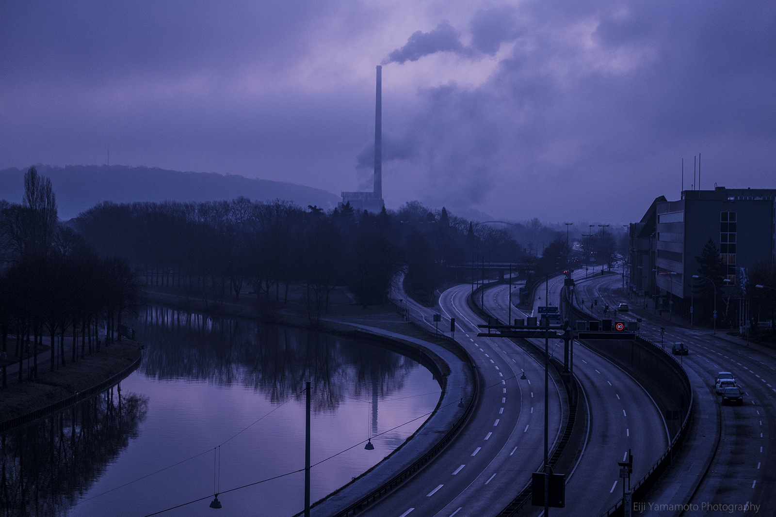 初日の出。雨が降っていなければ外に出ようと思い、午前7時半頃、降っていなかったので出てみました。気温は-3度となっていましたが、そこまでの寒さは感じません。それよりも地面が凍っており、そちらの方が気になりました。少し霧が出て曇っています。初日の出は撮れませんでしたが、車が走っていないアウトバーンや静かな街、美しい空などを撮ることが出来ました。