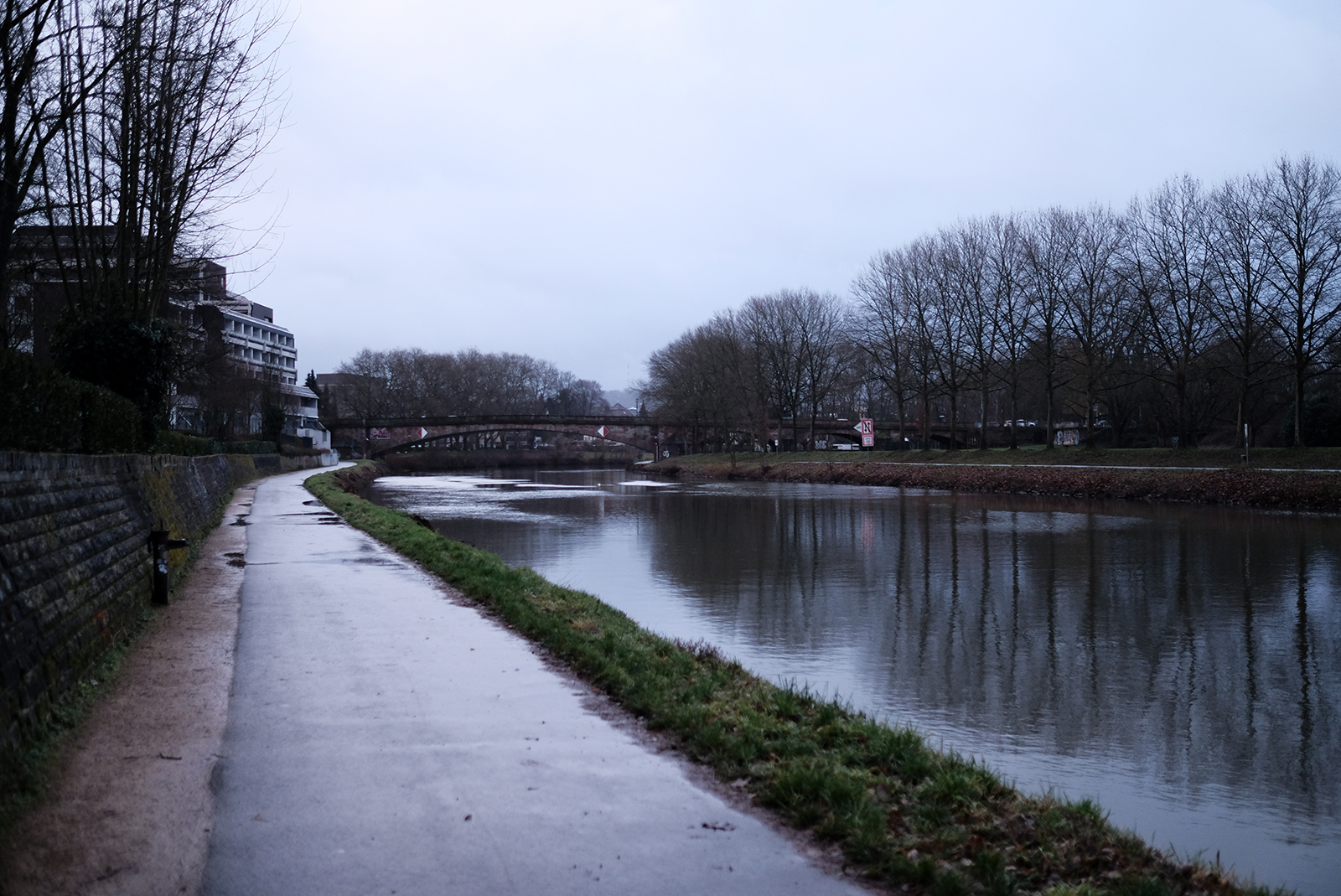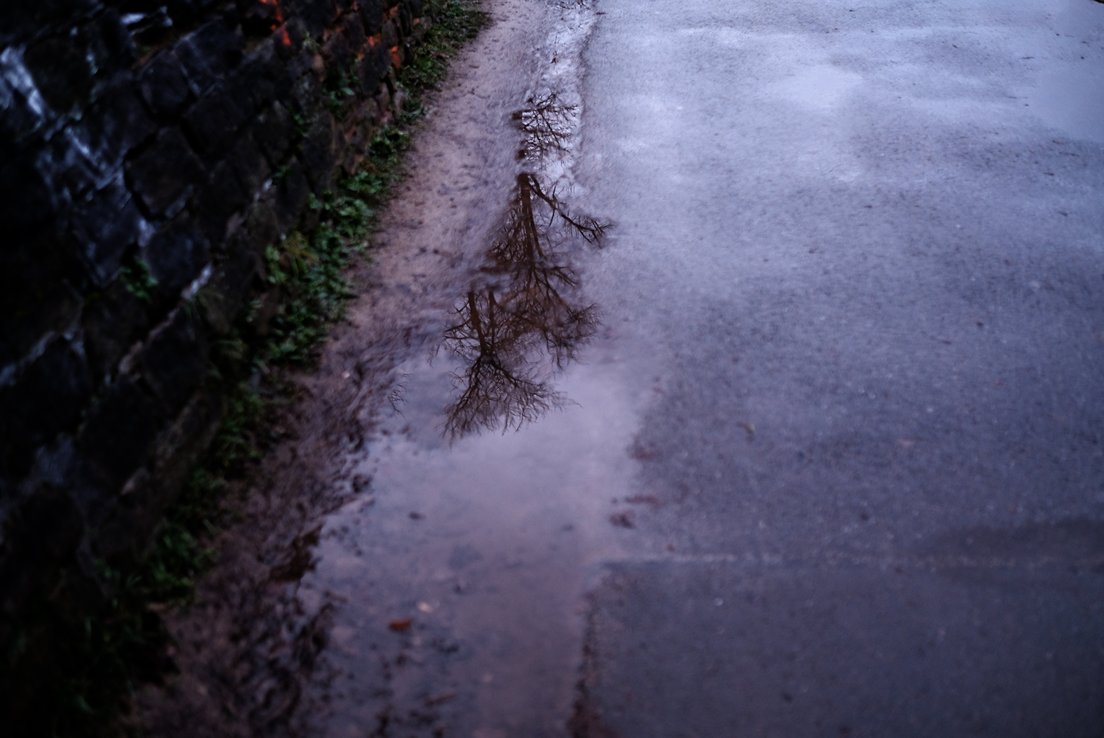 気温が低くなく、雨が降っていて昨日と同じような天候です。ところで普段は富士フイルムX-E3にXF18mm F2を着けています。35mm判換算で約27mm。今日は久しぶりにXF23mm F1.4を着けて昨日と同じところを歩きました。換算35mmです。前者はコンパクトで軽いレンズなので、左手で傘を差しながら、右手だけで構えて撮ることも可能ですが、後者はそれに比べて少し大きく重いので、右手だけで構えようとすると時々親指がQボタンなどにあたります。X-Pro2で使っていた時はそこまで重さを感じることがなかったのでボディとのバランスが良かったとも言えます。しかしこのレンズは撮っていて楽しさのあるレンズでファインダーを覗いて撮りたくなります。以下の写真は全て絞り開放です。