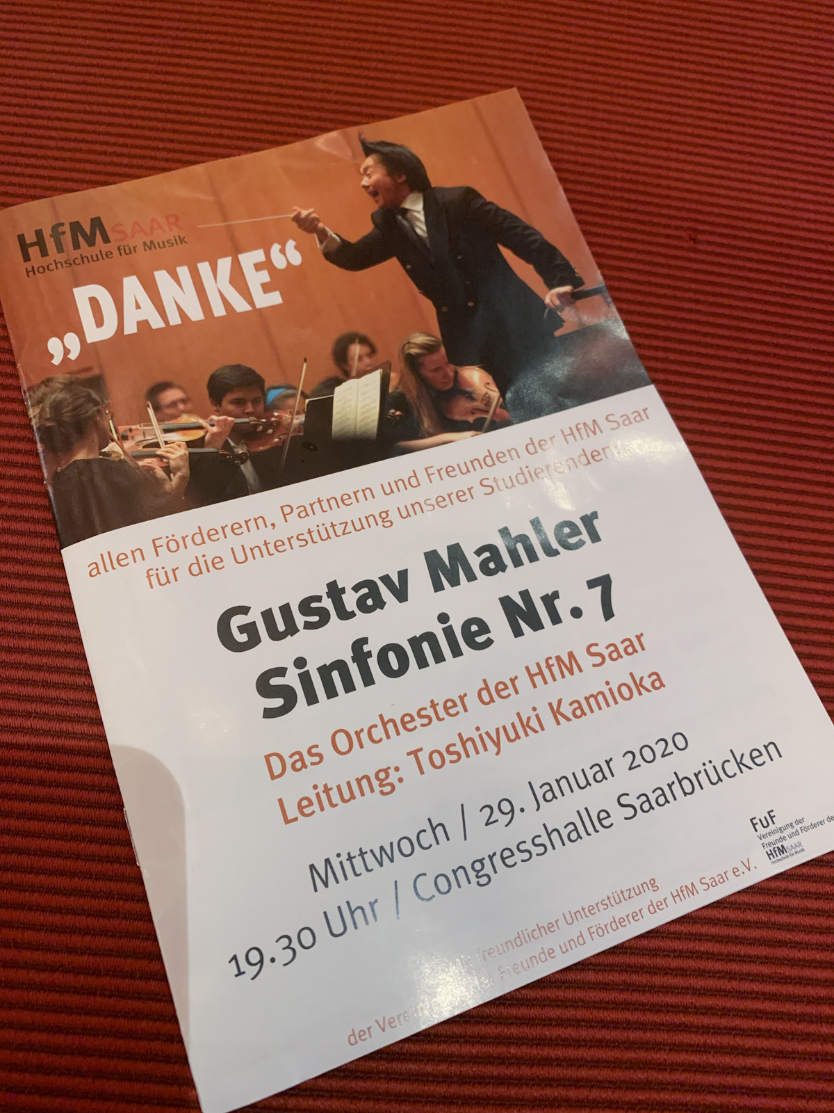 コングレスハレ(という名のホール)に行きました。ザール音大オーケストラ(上岡敏之指揮)でマーラー7番です。彼が指揮を振る音大オーケストラの公演はいつも一杯で、以前、音大ホールの外側にまで人が溢れ、その人たちのためにドアを開けてのコンサートとなったこともありました。今日は音大ホールよりも広い会場ですが、音大関係者だけでなく州政府関係者などもいたようで、ほぼ満員といった状況です。