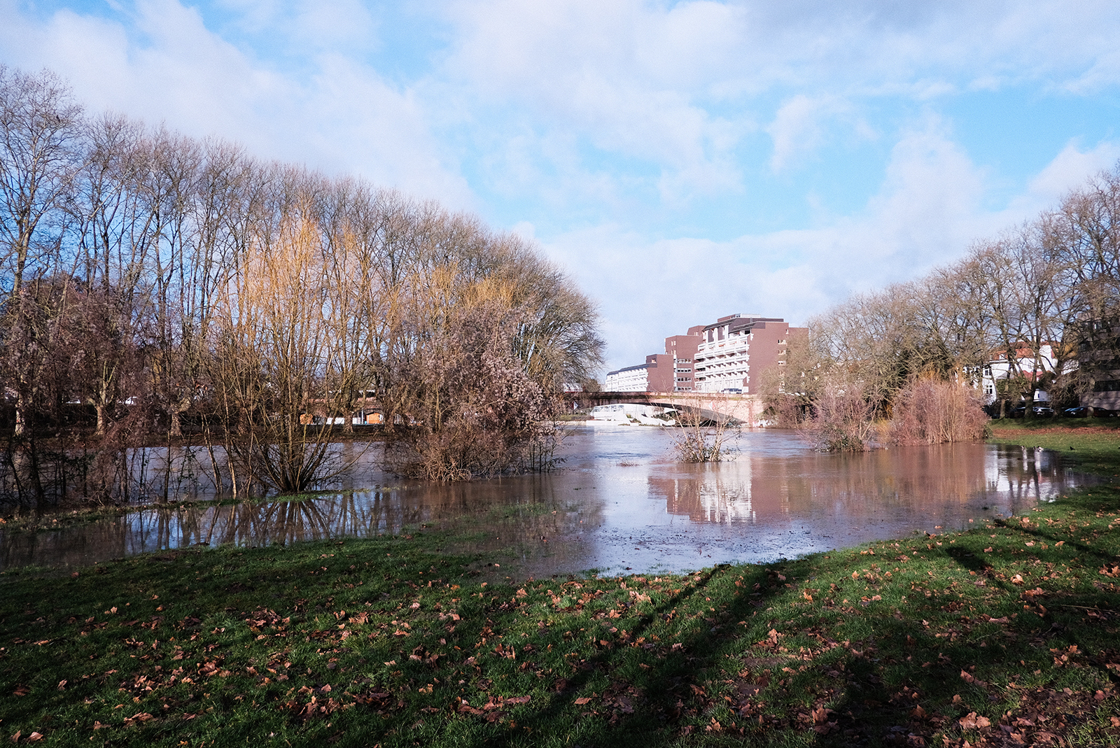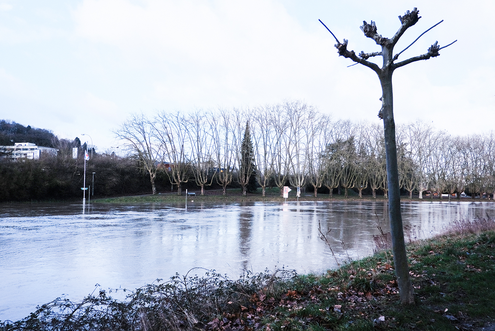 昨晩、強い雨が降っていましたが、その影響でザール川が増水しています。ニュースによるとドイツ南西部で同じようになっているとのこと。いつも歩いている川沿いの道が冠水しています。
