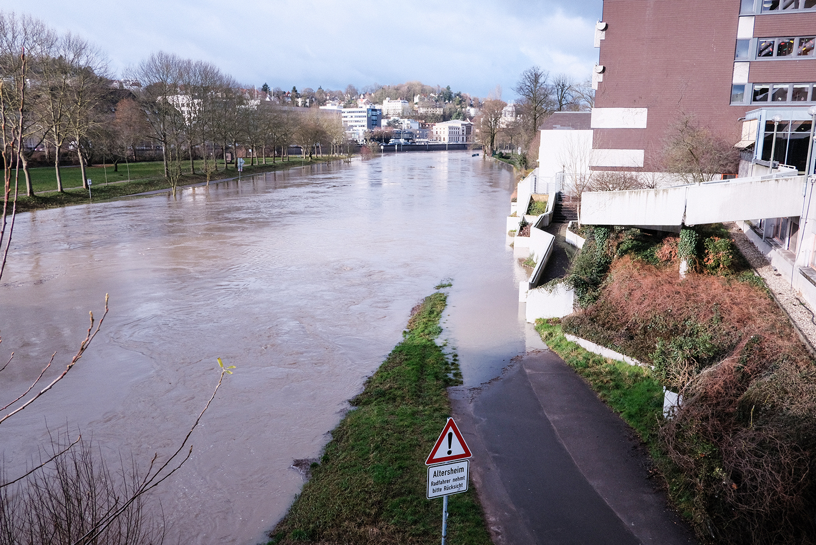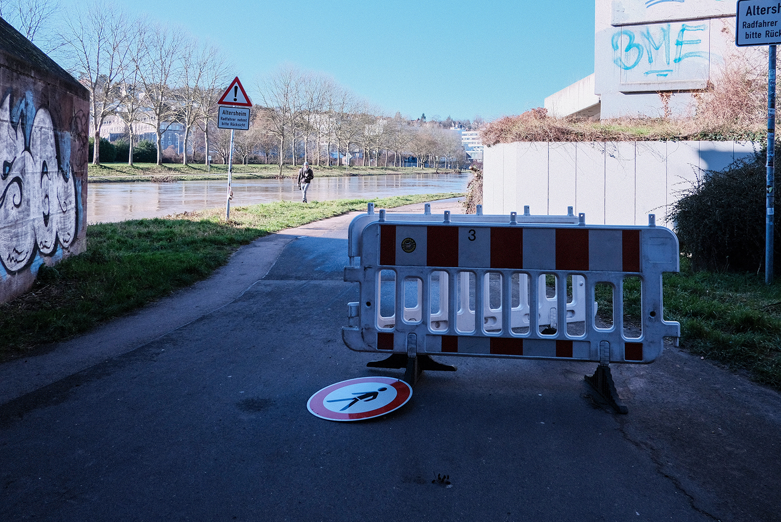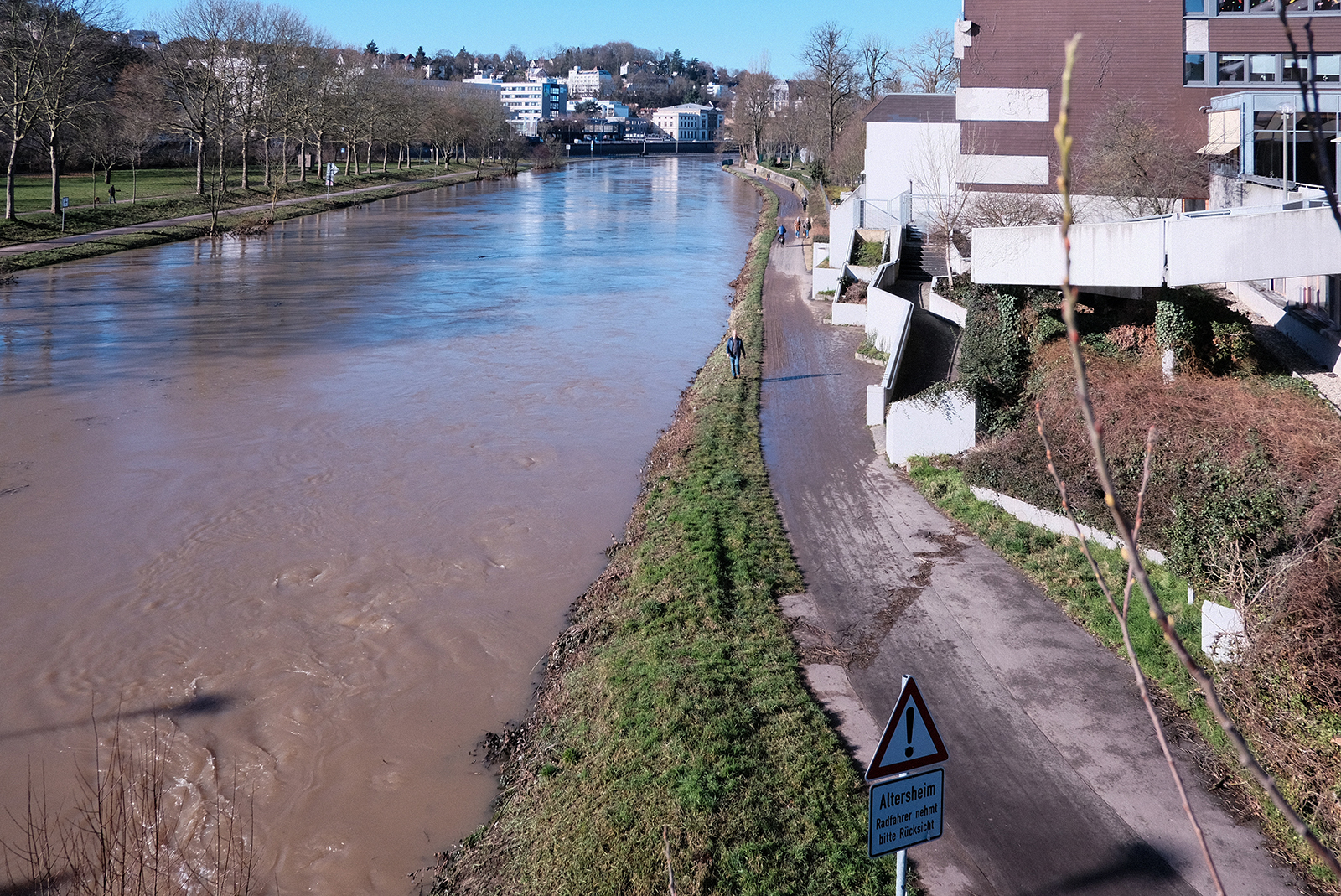 今日は水が引きましたが、歩道は泥が多く、草の上を歩いている人がいます。滑って落ちないか心配になります。