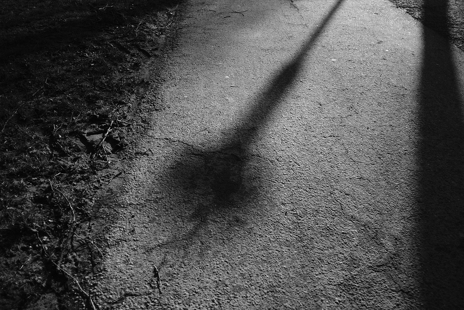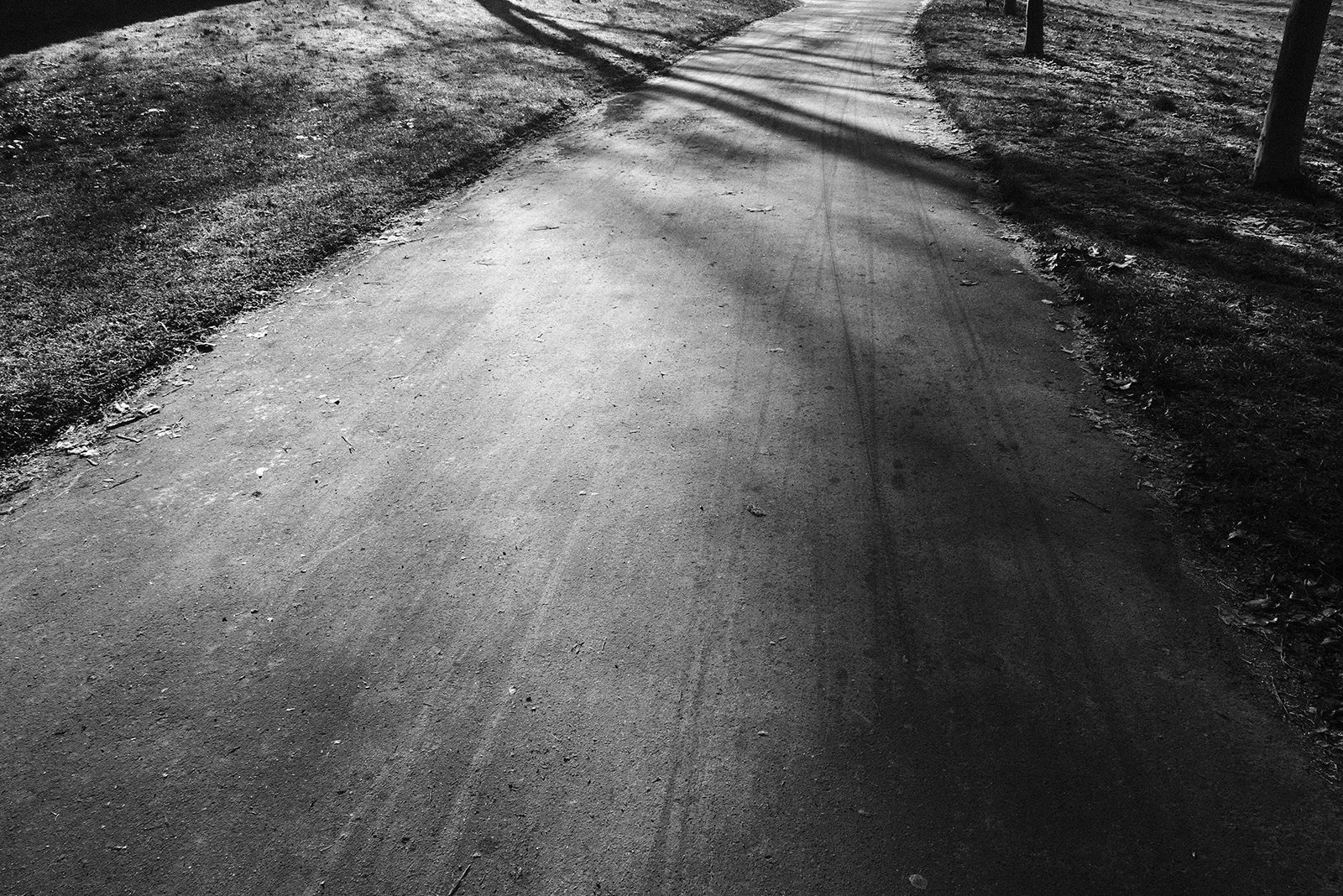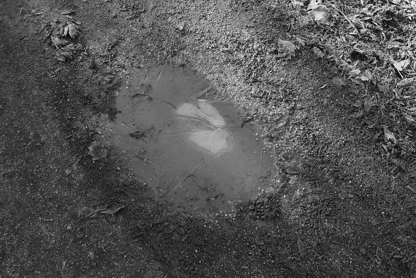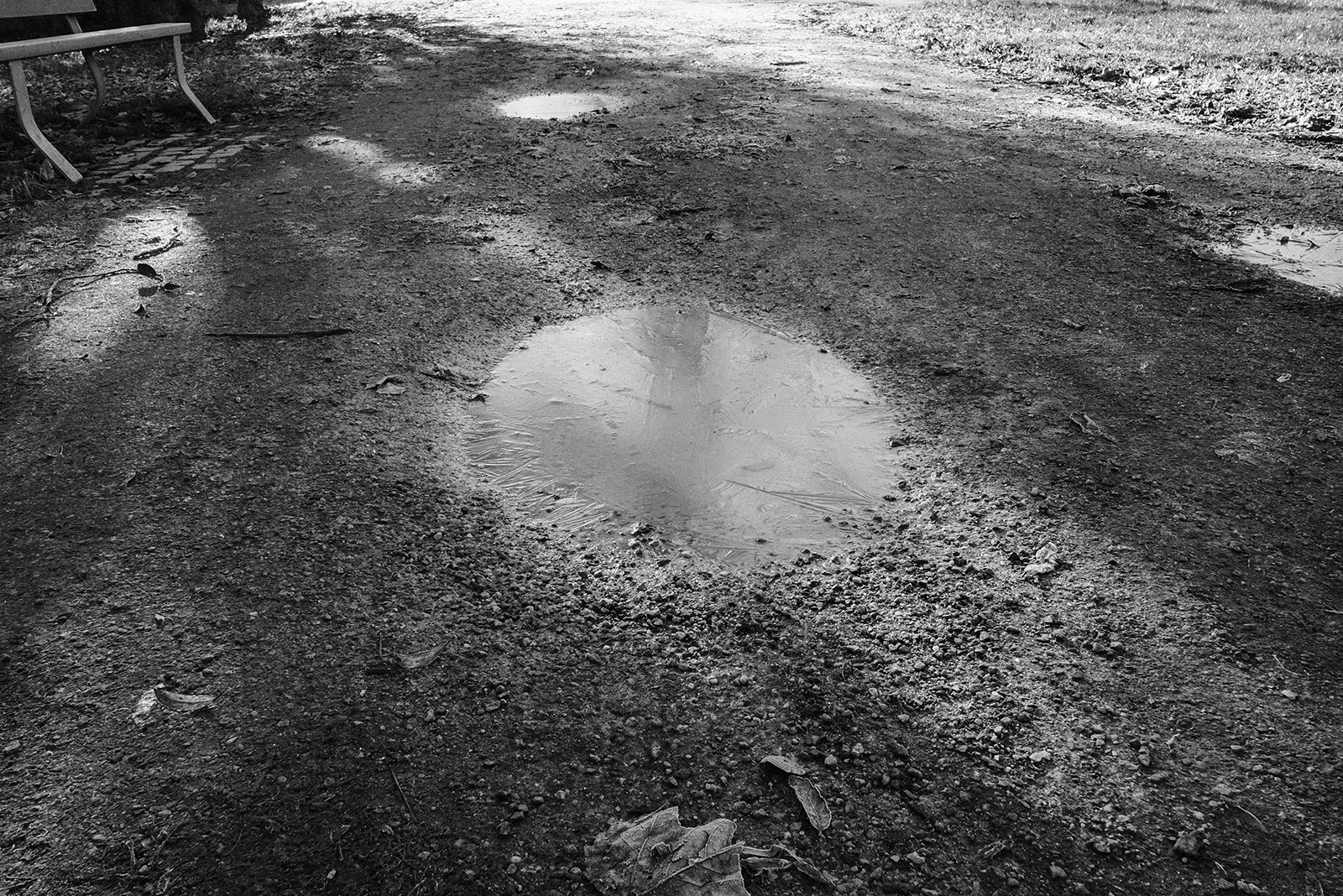 空気が冷たく、冷え込んだ朝です。霜が降りていて、小さな水たまりはその表面が凍っていました。しかし青空で空気が澄んでいて気持ちが良いです。そしてモノクロで単焦点レンズでの撮影はリズムがあって非常に楽しいです。冬は木々の葉っぱがなくて寂しくなりますが、逆に木の形や低い位置にある太陽の光と伸びる影など冬ならではの楽しみがあります。