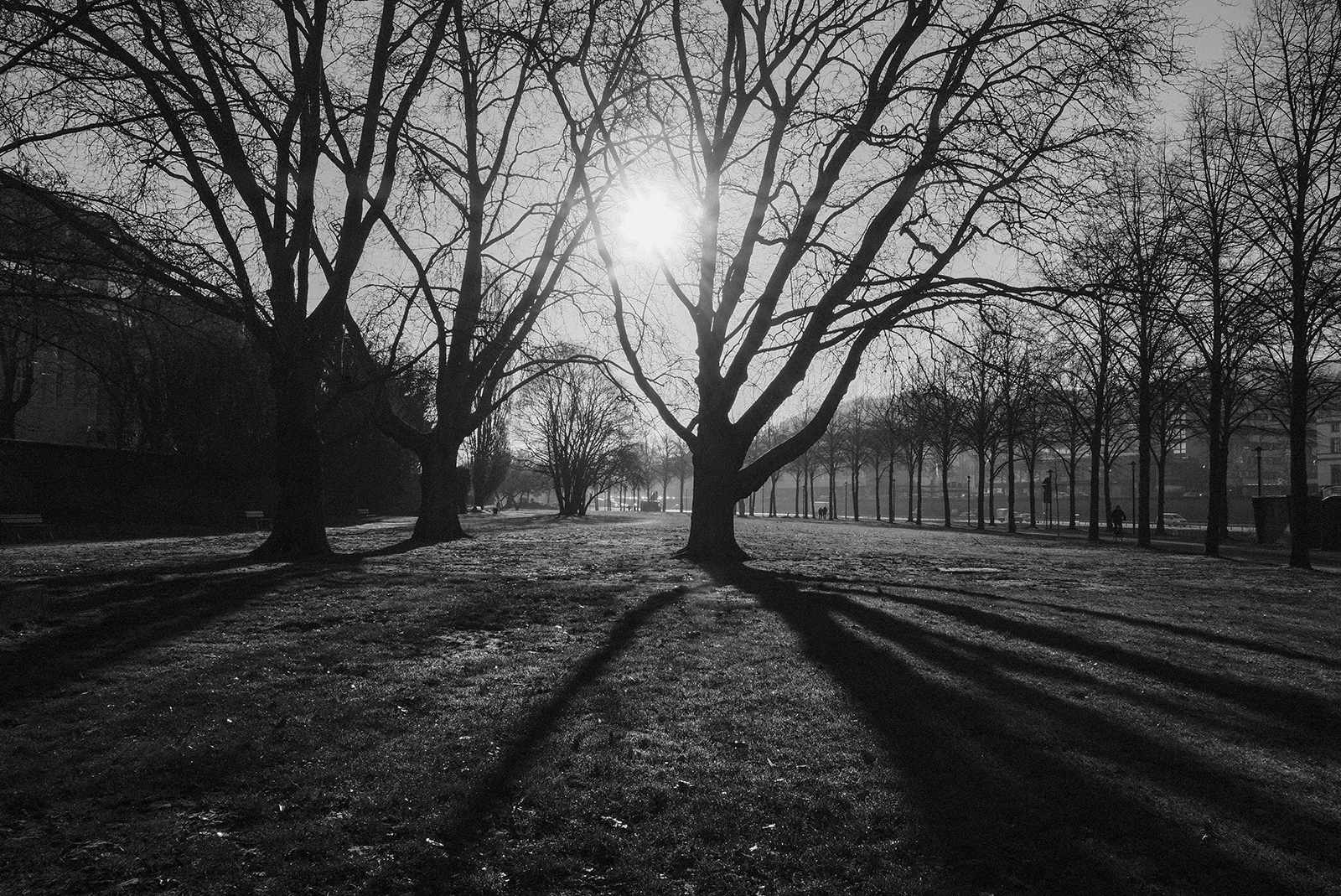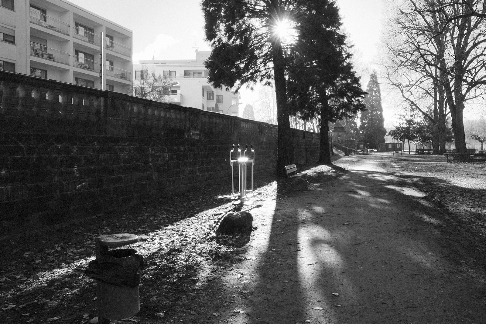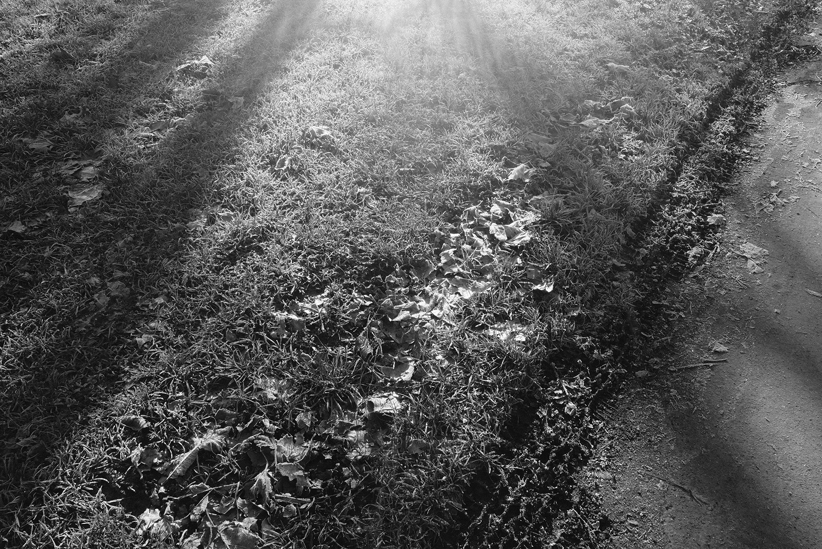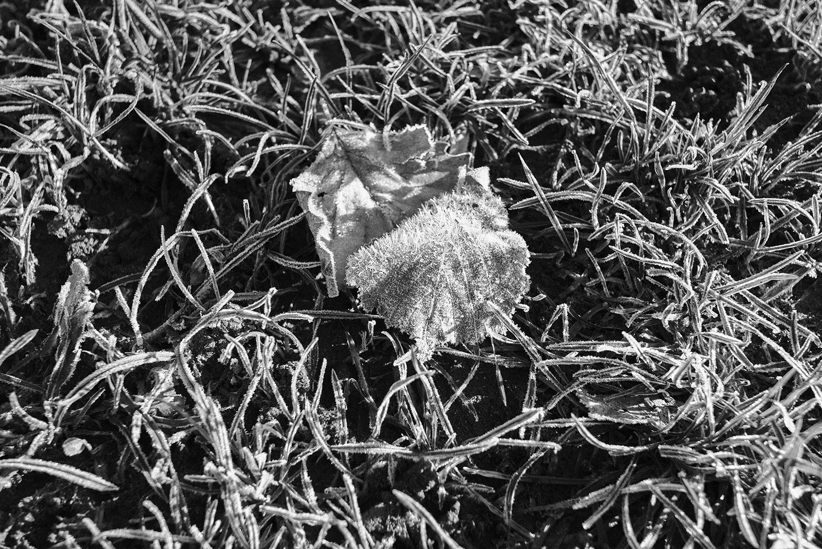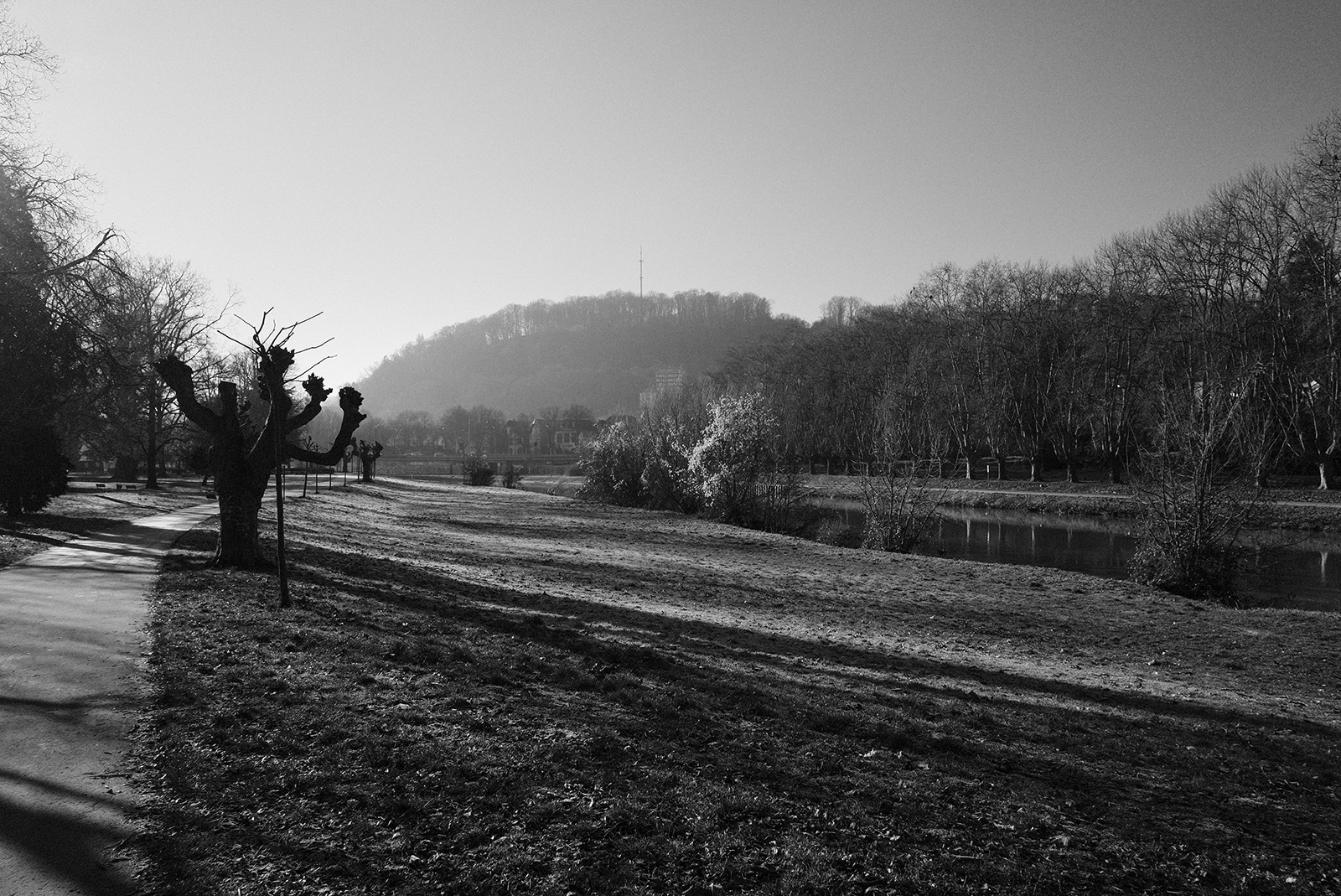 空気が冷たく、冷え込んだ朝です。霜が降りていて、小さな水たまりはその表面が凍っていました。しかし青空で空気が澄んでいて気持ちが良いです。そしてモノクロで単焦点レンズでの撮影はリズムがあって非常に楽しいです。冬は木々の葉っぱがなくて寂しくなりますが、逆に木の形や低い位置にある太陽の光と伸びる影など冬ならではの楽しみがあります。