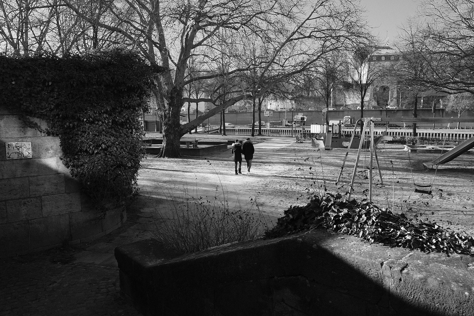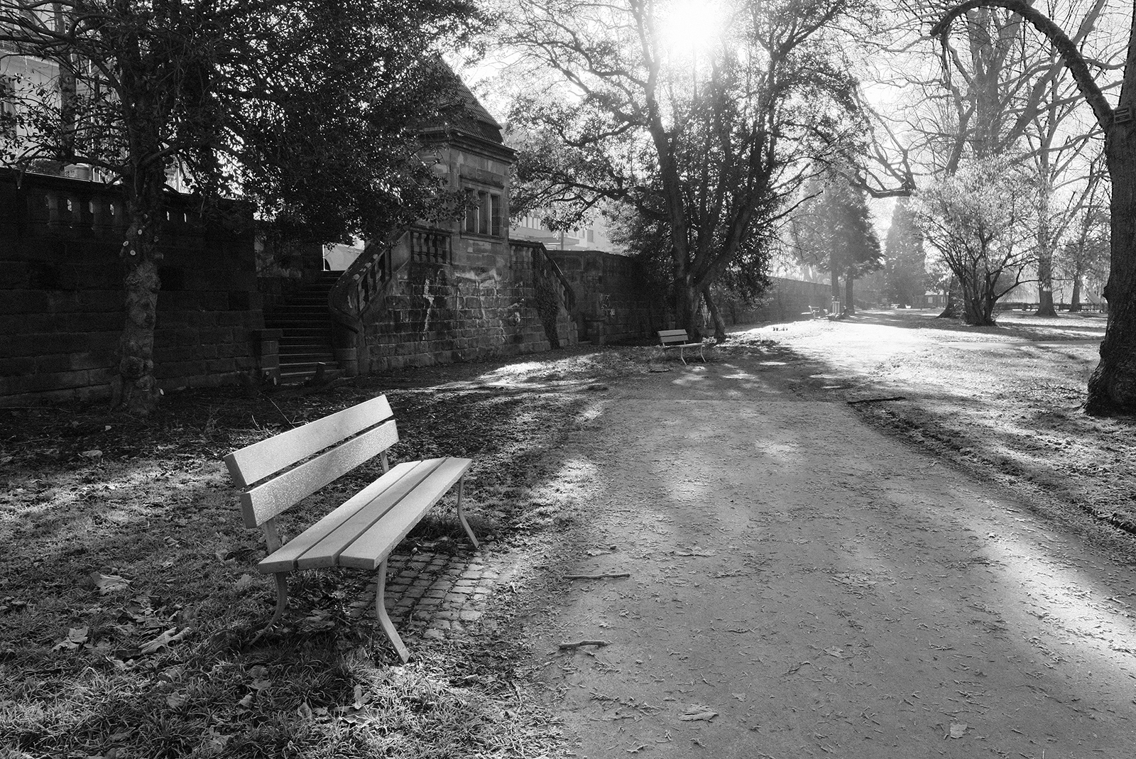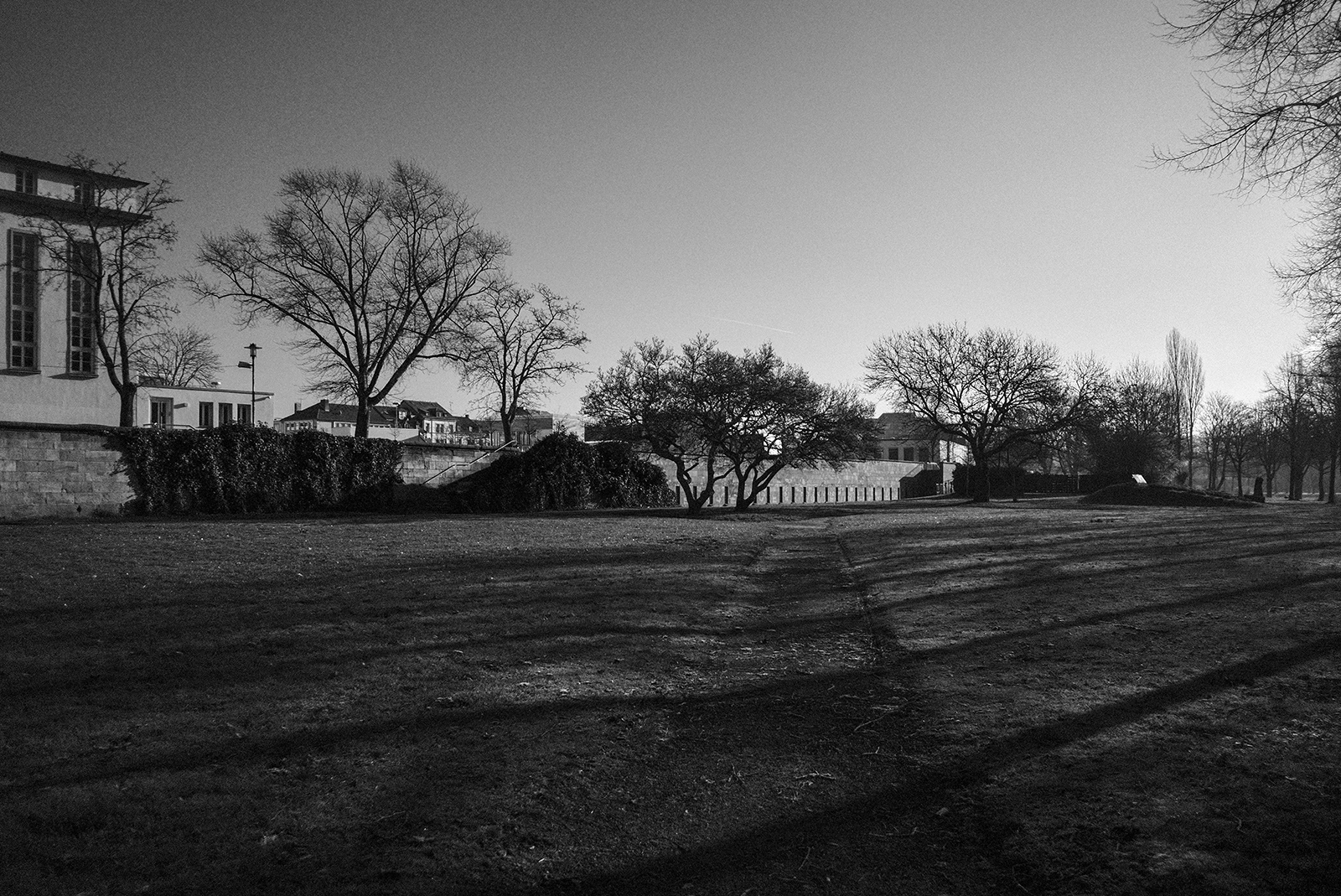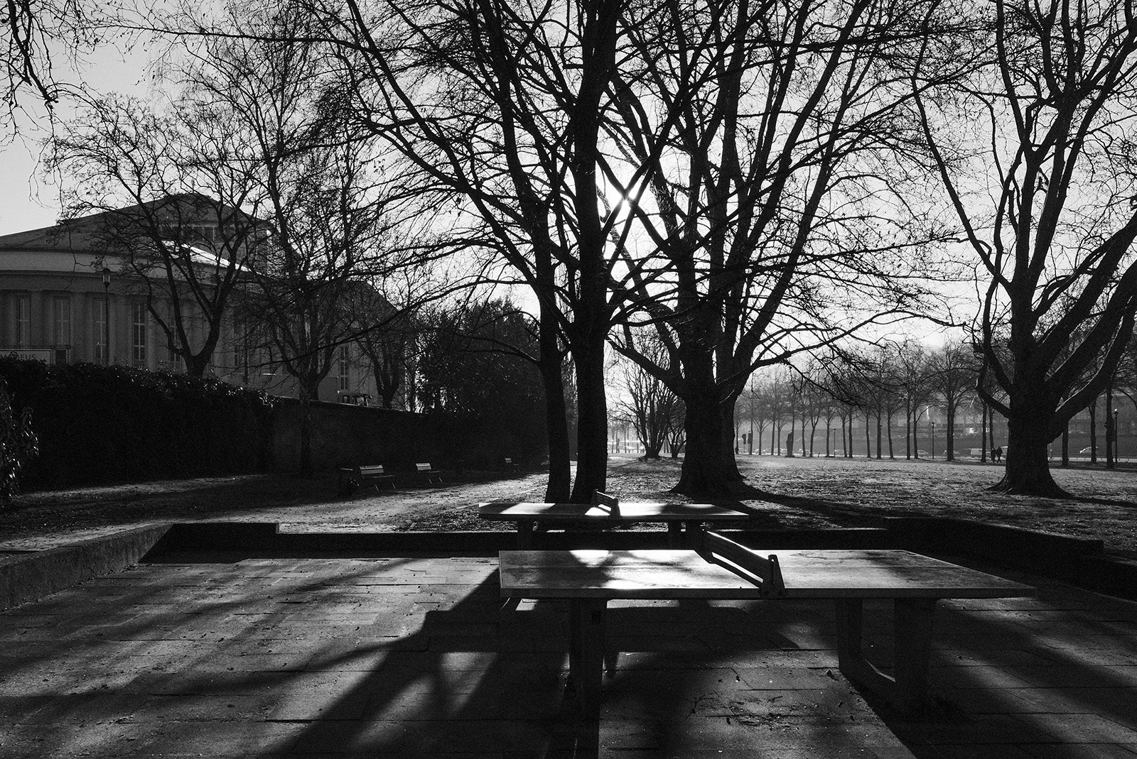 空気が冷たく、冷え込んだ朝です。霜が降りていて、小さな水たまりはその表面が凍っていました。しかし青空で空気が澄んでいて気持ちが良いです。そしてモノクロで単焦点レンズでの撮影はリズムがあって非常に楽しいです。冬は木々の葉っぱがなくて寂しくなりますが、逆に木の形や低い位置にある太陽の光と伸びる影など冬ならではの楽しみがあります。