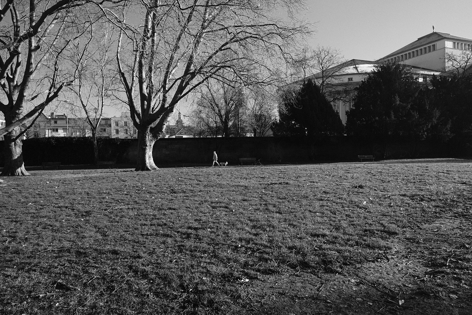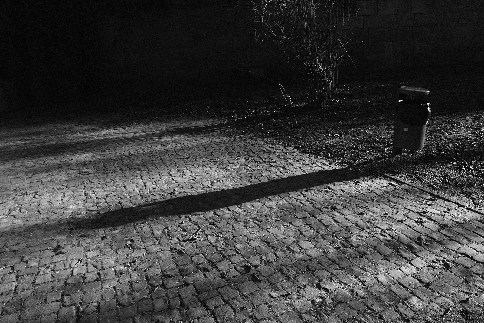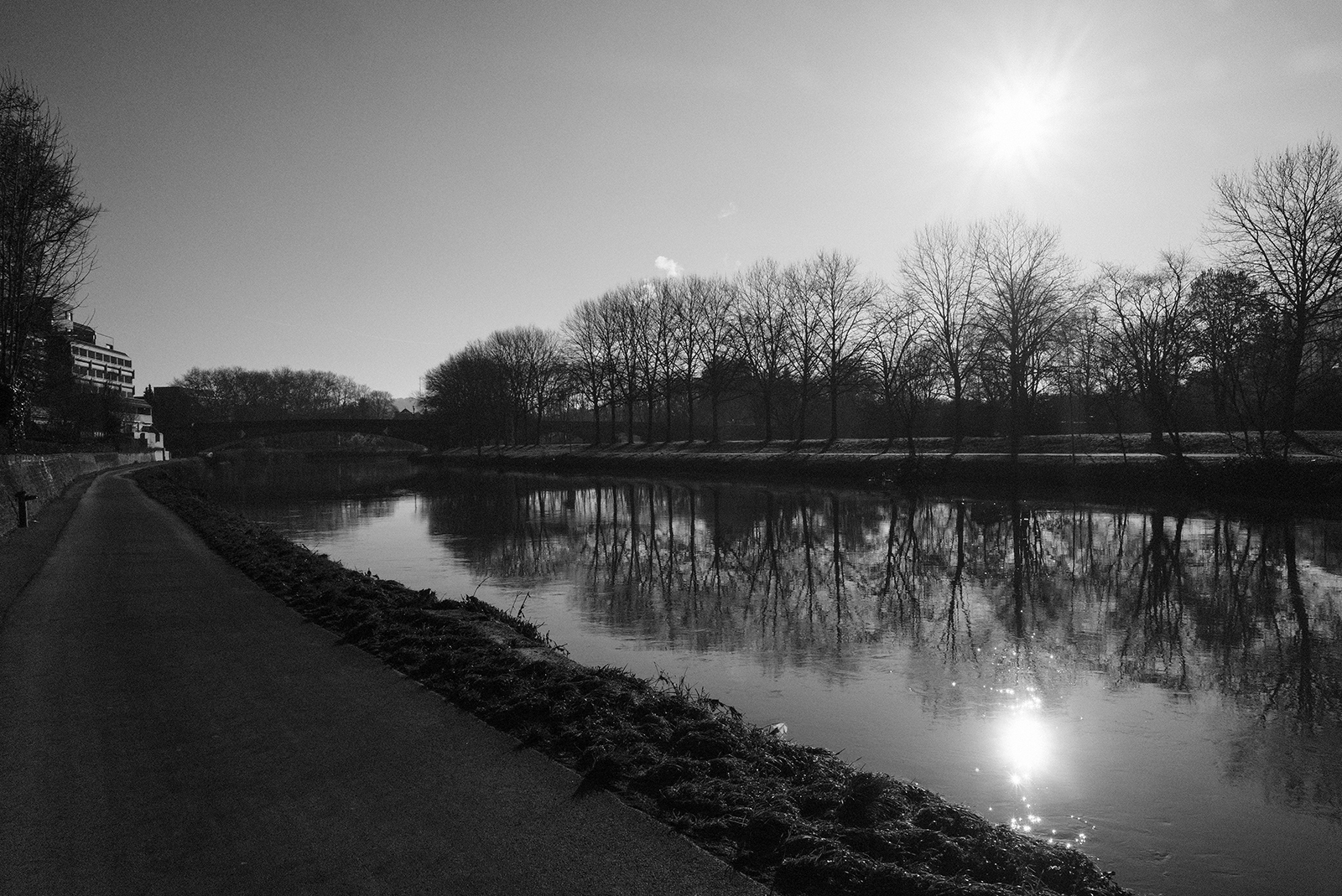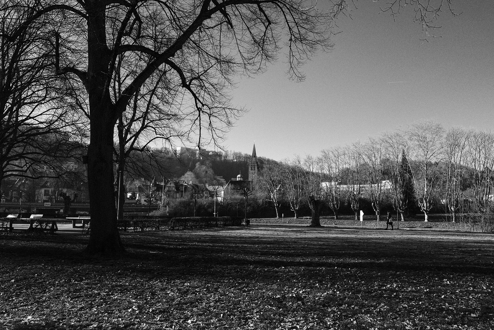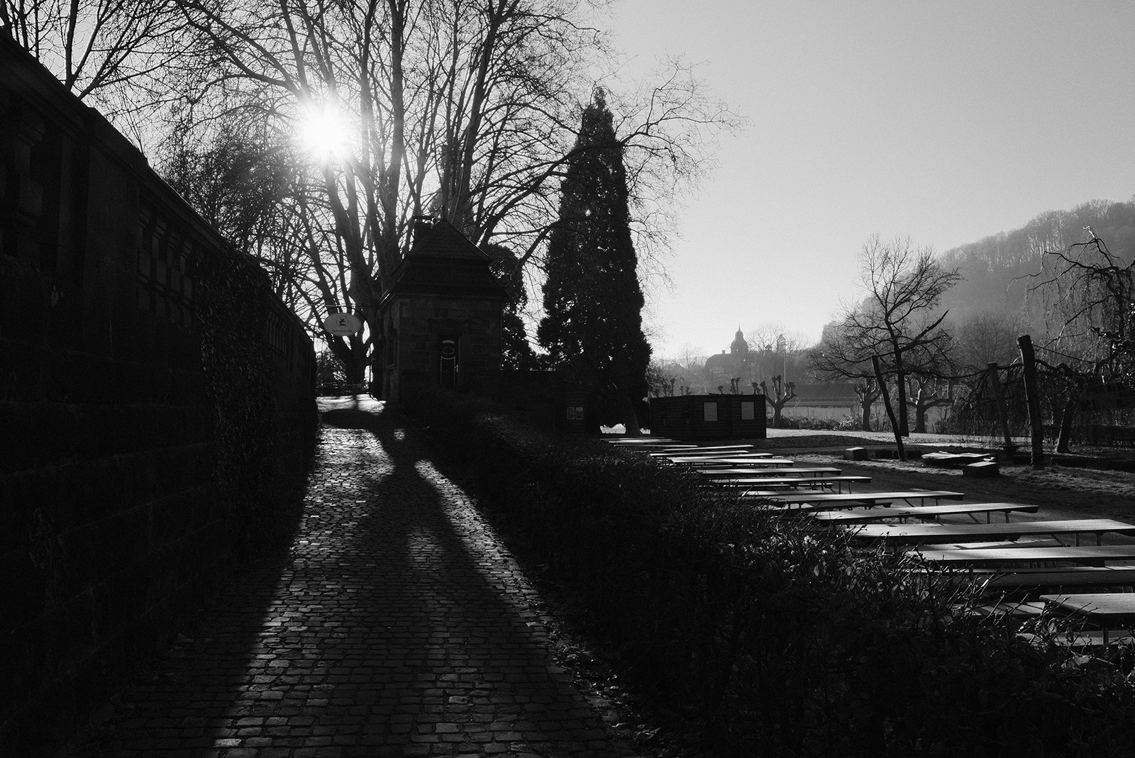 空気が冷たく、冷え込んだ朝です。霜が降りていて、小さな水たまりはその表面が凍っていました。しかし青空で空気が澄んでいて気持ちが良いです。そしてモノクロで単焦点レンズでの撮影はリズムがあって非常に楽しいです。冬は木々の葉っぱがなくて寂しくなりますが、逆に木の形や低い位置にある太陽の光と伸びる影など冬ならではの楽しみがあります。