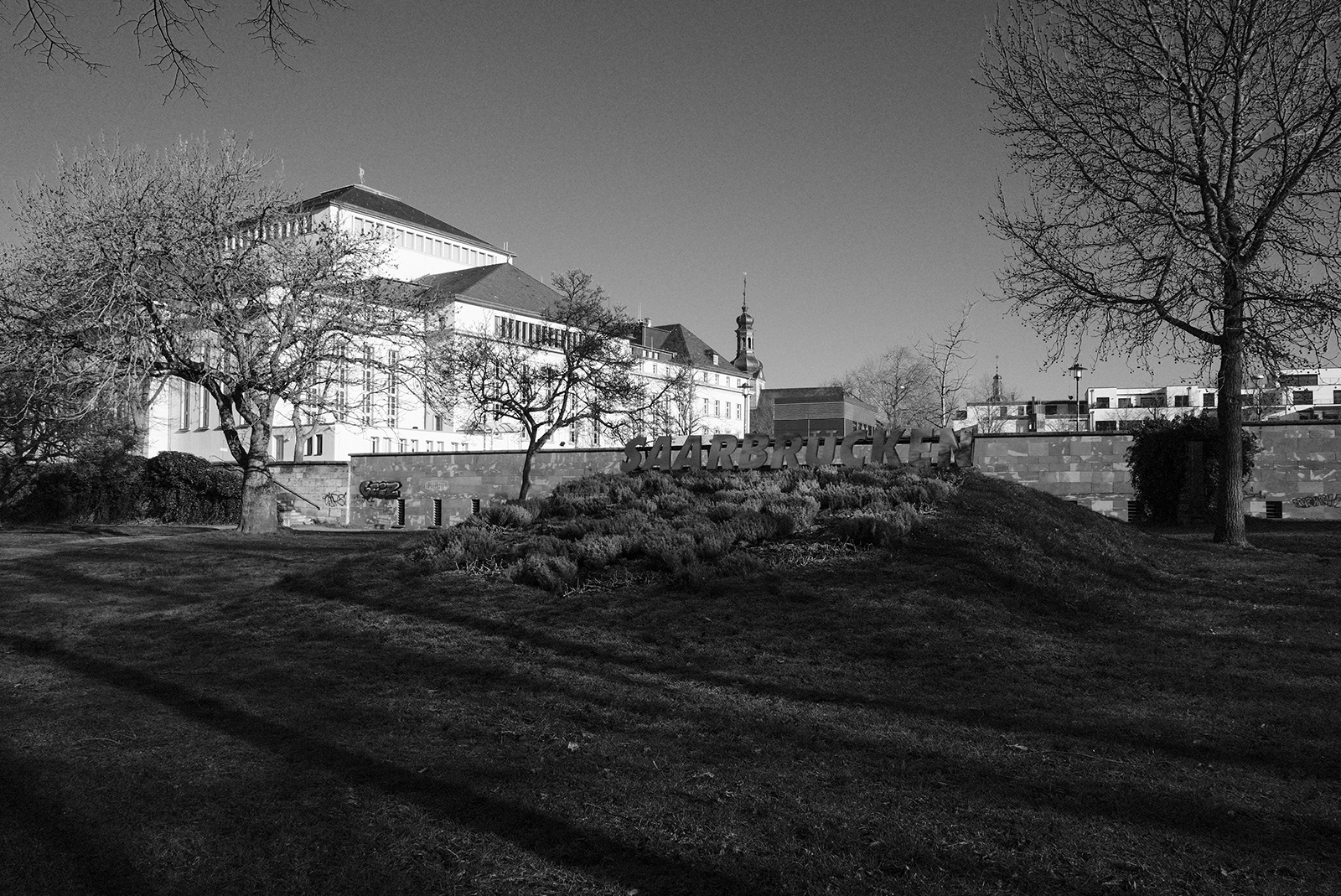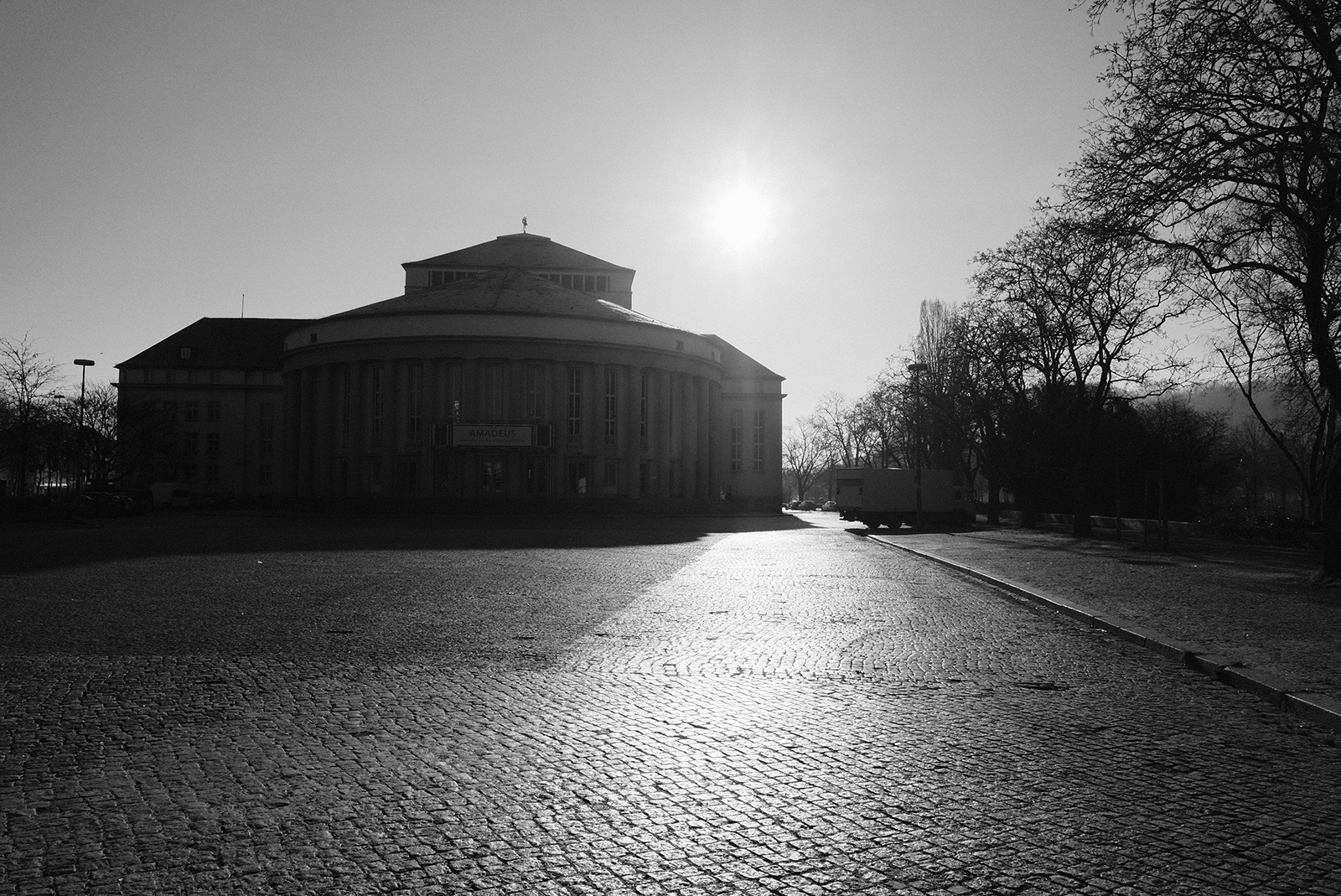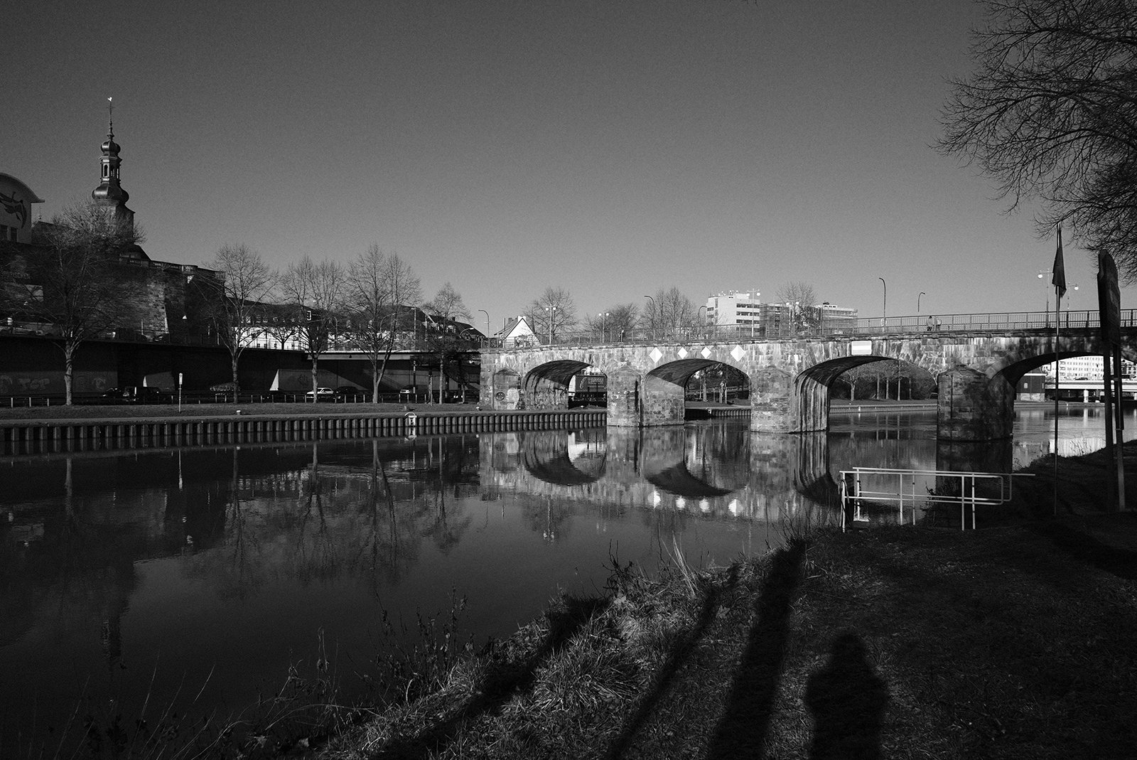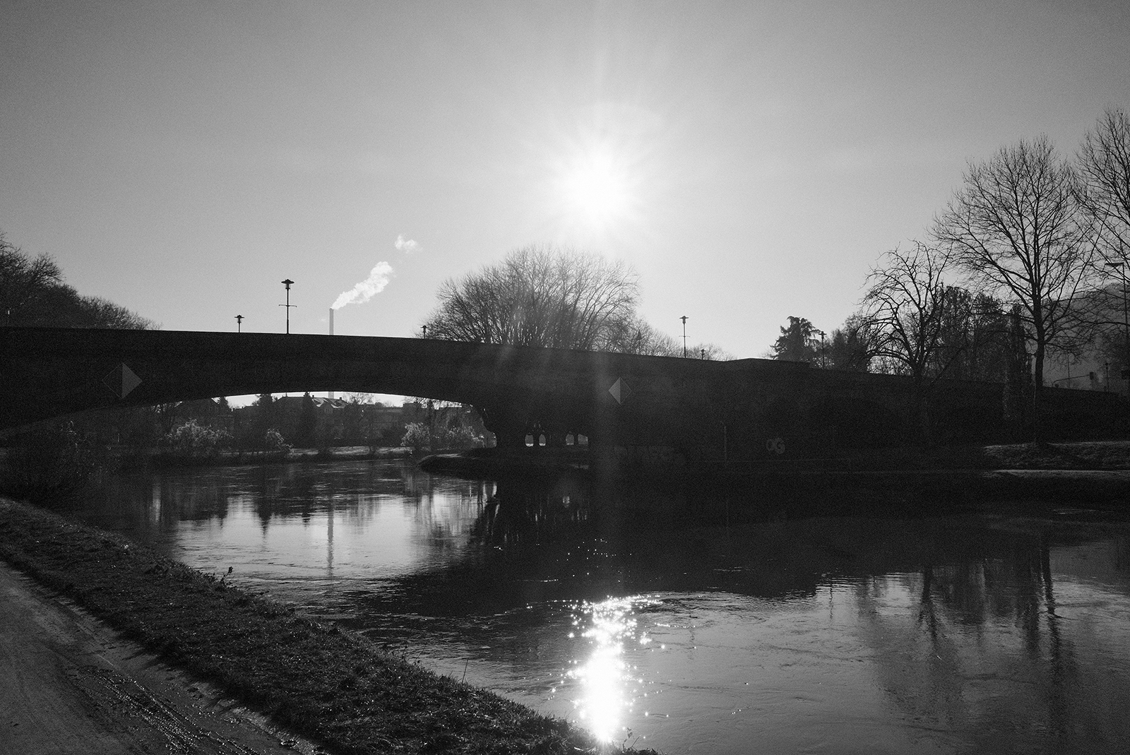 空気が冷たく、冷え込んだ朝です。霜が降りていて、小さな水たまりはその表面が凍っていました。しかし青空で空気が澄んでいて気持ちが良いです。そしてモノクロで単焦点レンズでの撮影はリズムがあって非常に楽しいです。冬は木々の葉っぱがなくて寂しくなりますが、逆に木の形や低い位置にある太陽の光と伸びる影など冬ならではの楽しみがあります。