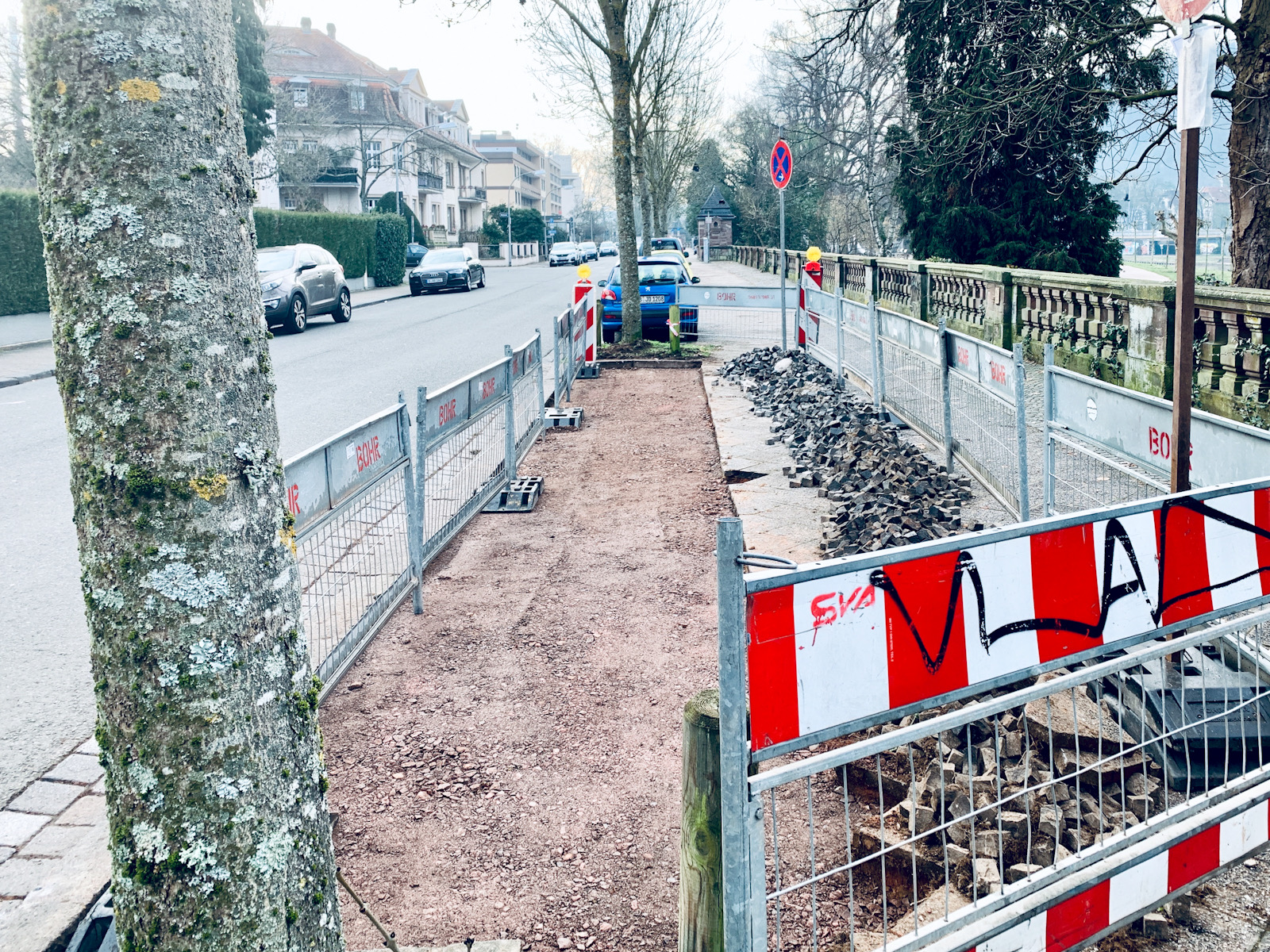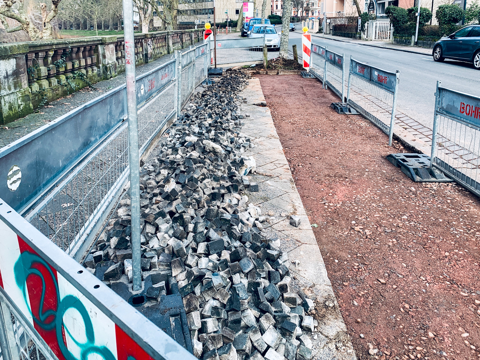 近所で工事をしています。これから掘って作業をするのか、それとも既に終わって埋められ、あとは石畳の石を敷き詰めるだけなのか分かりませんが、石畳を敷き詰める作業に興味があります。他の場所でも同じような作業をしていましたが、石を並べる職人の技術には驚きました。パズルのような地道な作業です。僅かこれだけの場所ですがどれほどの時間で仕上がるのか興味があります。