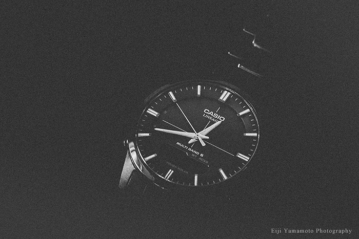 CASIOのLINEAGEという腕時計を使っています。日本とヨーロッパ対応の電波時計でソーラー電池のものです。黒色ですが、その光り方が良かったのでモノクロで撮ってみました。