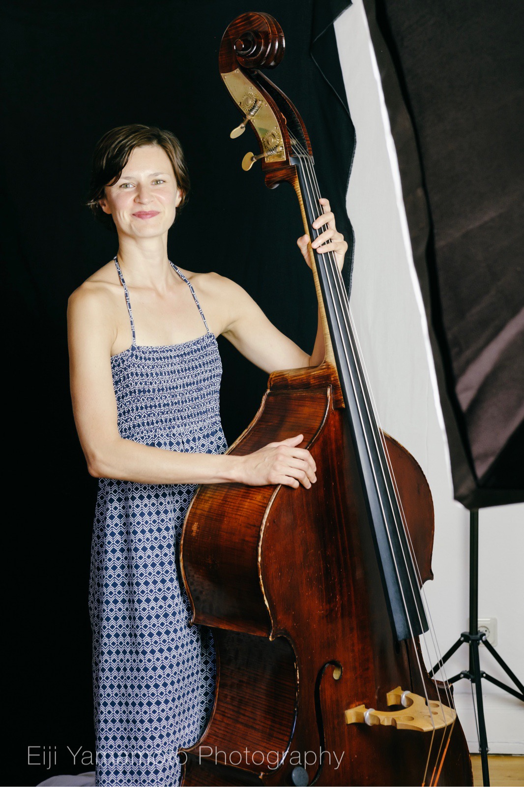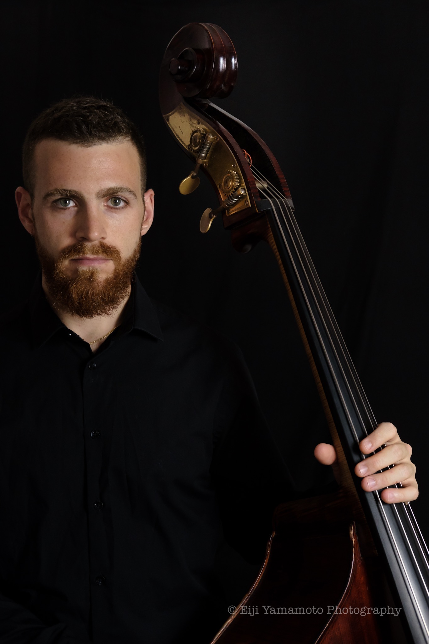 黒の衣装を出来るだけ目立たせないように、顔と楽器を意識しての撮影です。最近は少しの自然光とソフトボックス1灯の片側だけ点けて撮影することが多いです。落ち着いた雰囲気と目ヂカラです。