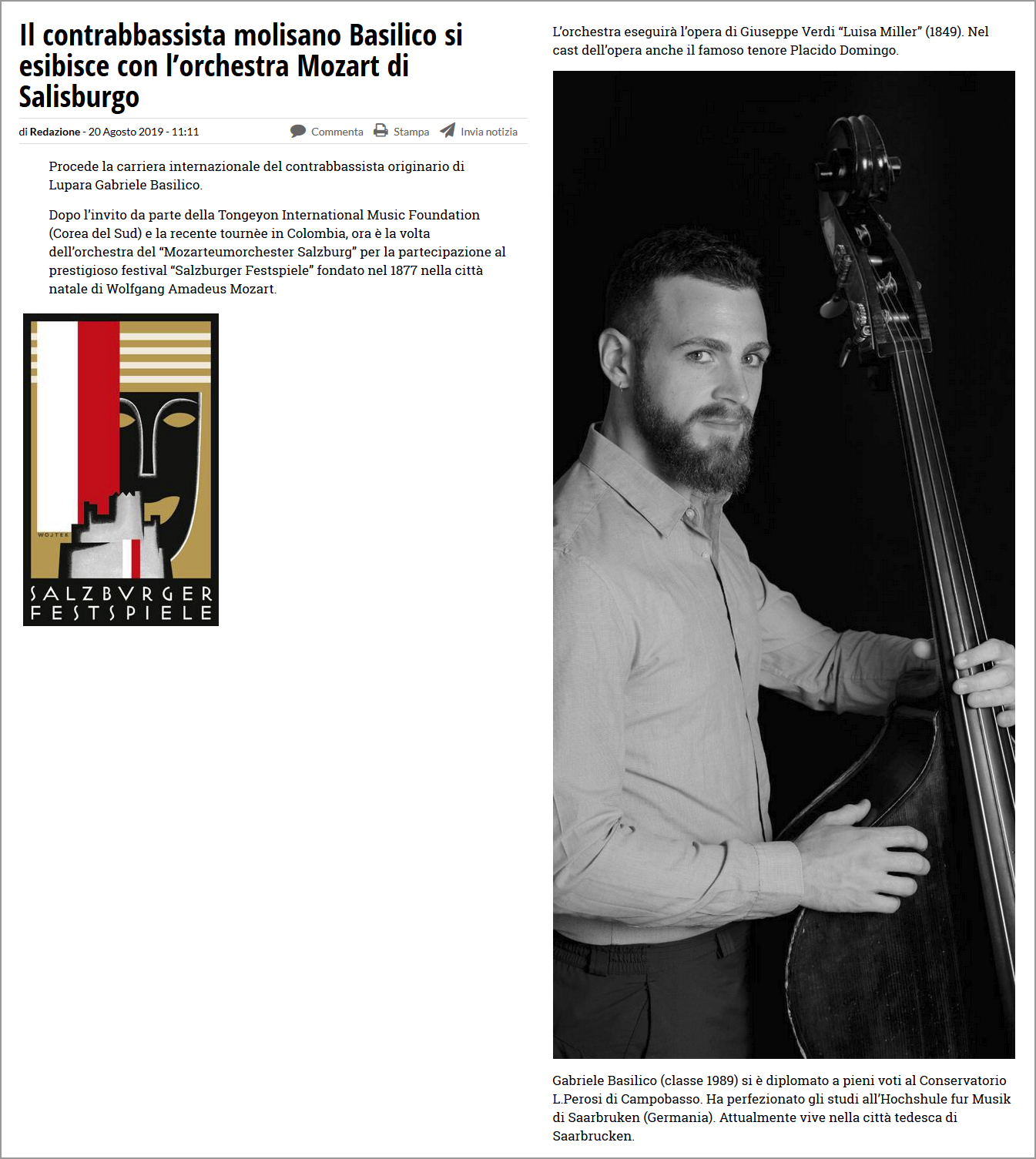 少し前に撮影させていただいたコントラバス奏者ですが、彼の出身地であるイタリアで彼が紹介されたようです。オンライン版で宣伝が多かったので、それ以外をスクリーンショットで撮りました。撮影者である私の名前は入っていませんが、この記事を紹介していただいた所には入っていました。いずれにしても嬉しいことです。今後の更なる活躍が楽しみです。