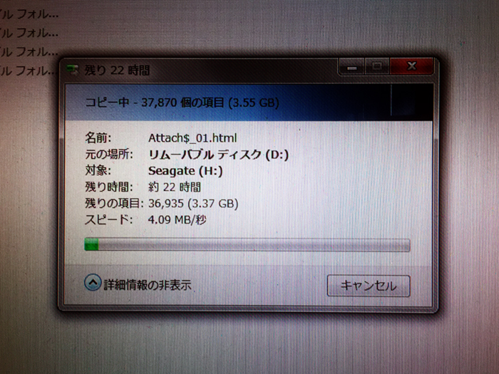 データの移動を行いました。残り時間約22時間となっていますが、そこまではかかりませんでした。