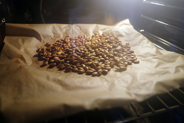 そういえばネットでかぼちゃの種も食べられるとあったので、それを真似てオーブンに入れてみました。