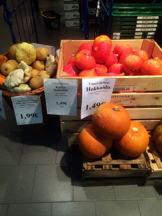 ハロウィンの季節になるとスーパーにかぼちゃが並びます。最近よく目にするのはHokkaido(北海道)という品種です。栗に似ているといった表記を目にしたことがあります。ドイツで一般的に売られているかぼちゃの多くは、べちゃべちゃしたものが多く、日本のもののようにしっかりとしたものではありません。Hokkaidoはドイツの一般的なかぼちゃに比べると少し日本ぽいかもしれません。