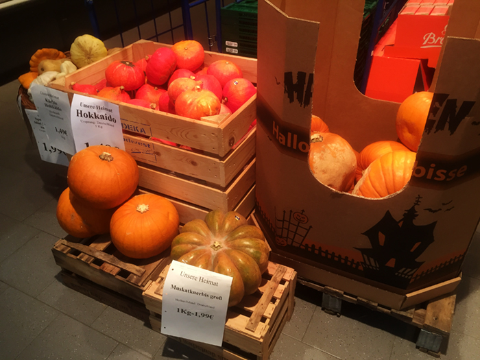 また飾り用の巨大なかぼちゃも売られています。日本のものは中身も硬めで切るのが難しいですが、ドイツのは柔らかいので中をくりぬいて飾ることが可能なのかもしれません。