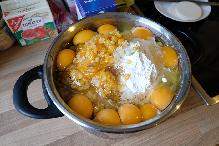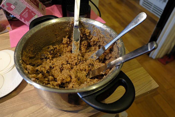以前知り合った滋賀出身の写真家の方の誕生日でした。午後、一緒にレープクーヘンを焼きました。材料を全て鍋に入れたところです。これを手で混ぜれば昨日の投稿のような生地になります。