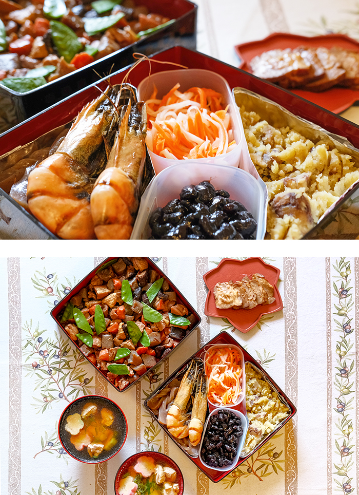 お昼過ぎにお雑煮とおせち料理を食べました。ほぼ全て妻の手作りです。